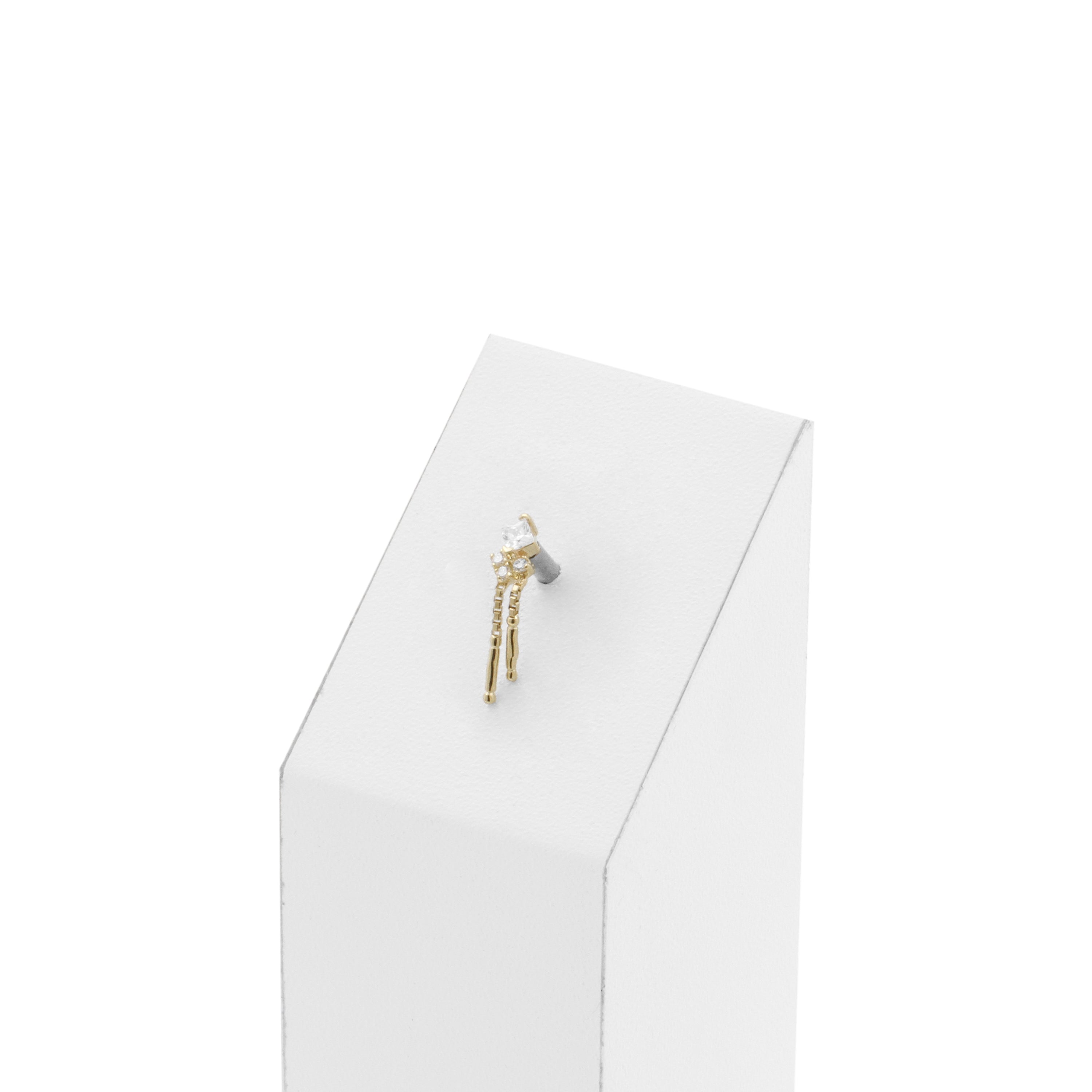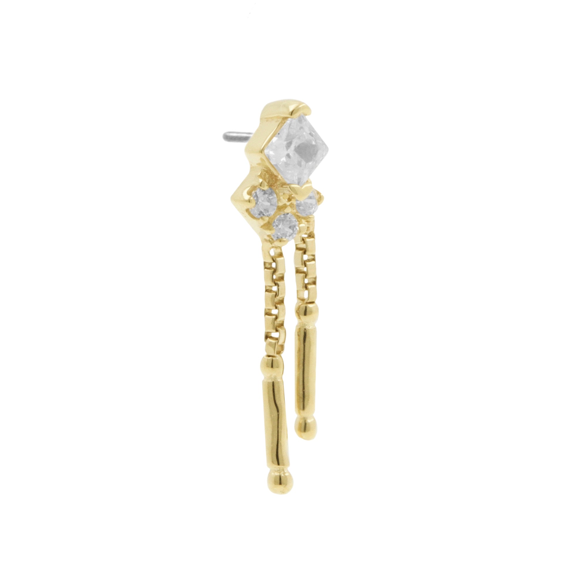 14 Karat Gold Square Zirconia Dangle instantly adds a stylish touch to your piercing. This Threadless Top is made of 14 Karat Gold with a cubic zirconia in Clear. The threadless system allows you to easily combine this top with all our bars, which we call Threadless Base, for a perfect fit and ultimate comfort.