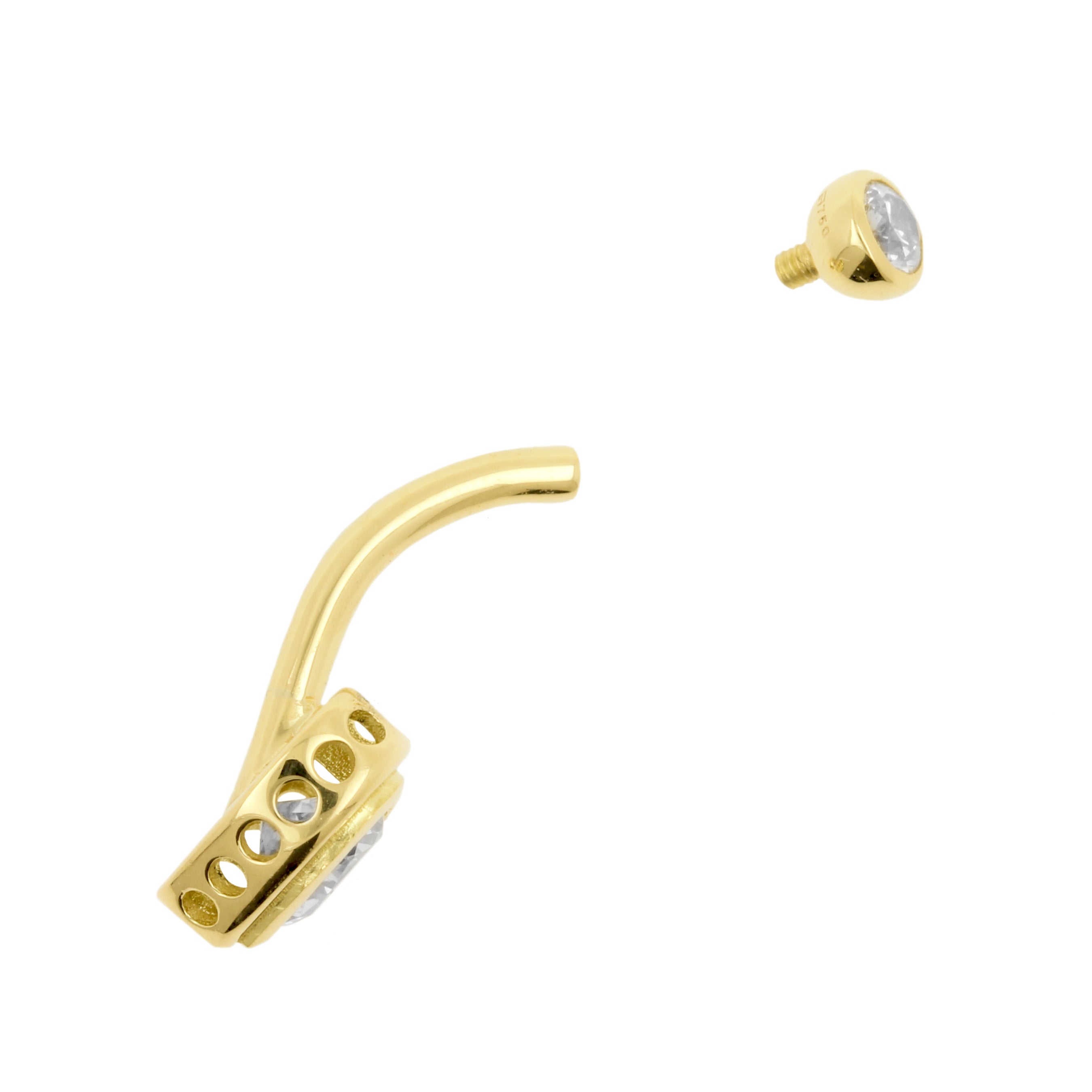The belly bar features internally threaded construction for comfortable wear and secure placement. High-quality 18k gold provides durability and a warm, timeless shine.