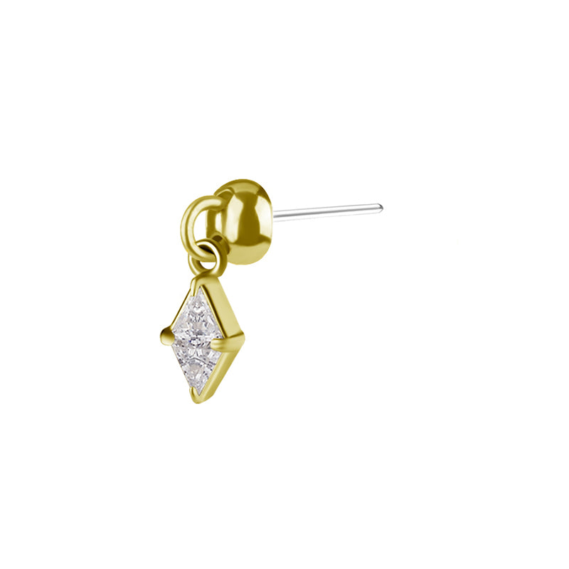 18 Karat Gold Helix Dangle - Zirconia Diamond Gold instantly adds a stylish touch to your piercing. This Threadless Top is made of 18 Karat Gold with a cubic zirconia in Clear. The threadless system allows you to easily combine this top with all our bars, which we call Threadless Base, for a perfect fit and ultimate comfort.