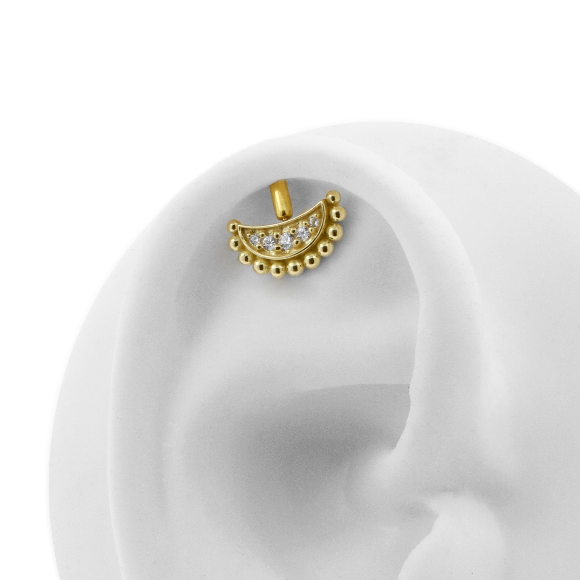 18 Karat Gold Vertical Helix Moon instantly adds a stylish touch to your piercing. This Threadless Top is made of 18 Karat Gold with a cubic zirconia in Clear. The threadless system allows you to easily combine this top with all our bars, which we call Threadless Base, for a perfect fit and ultimate comfort.