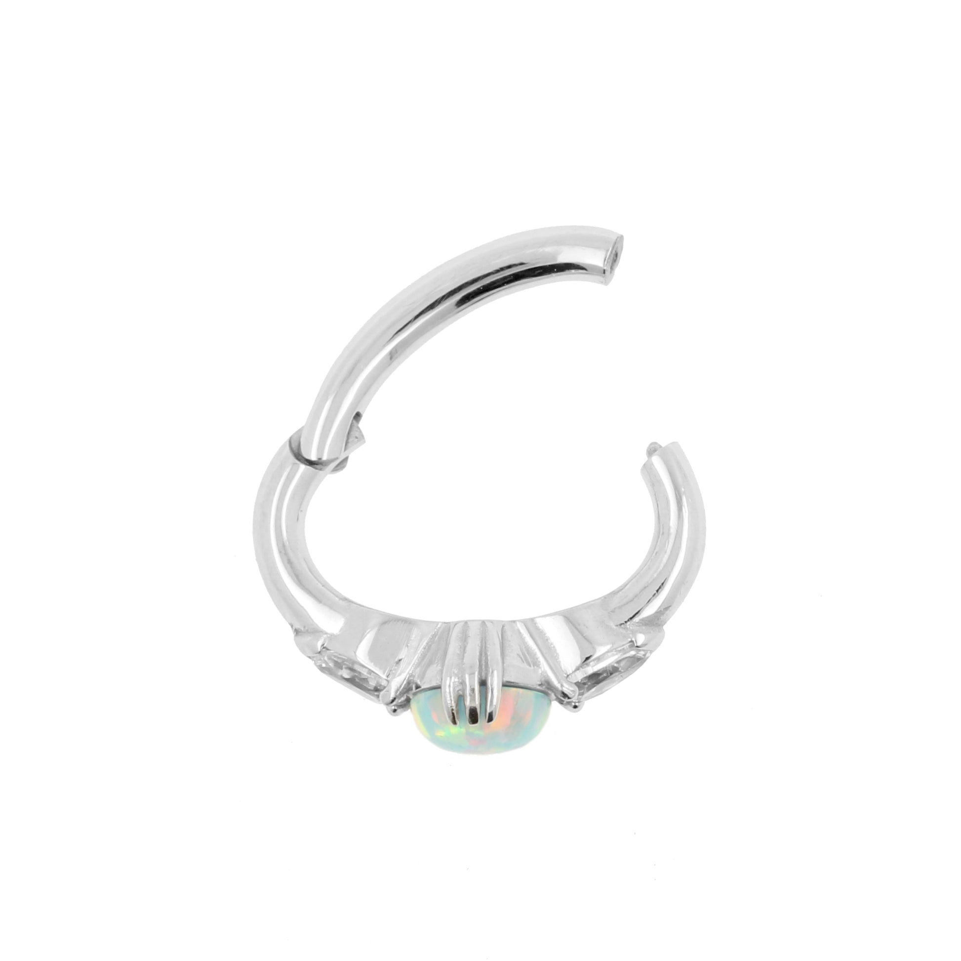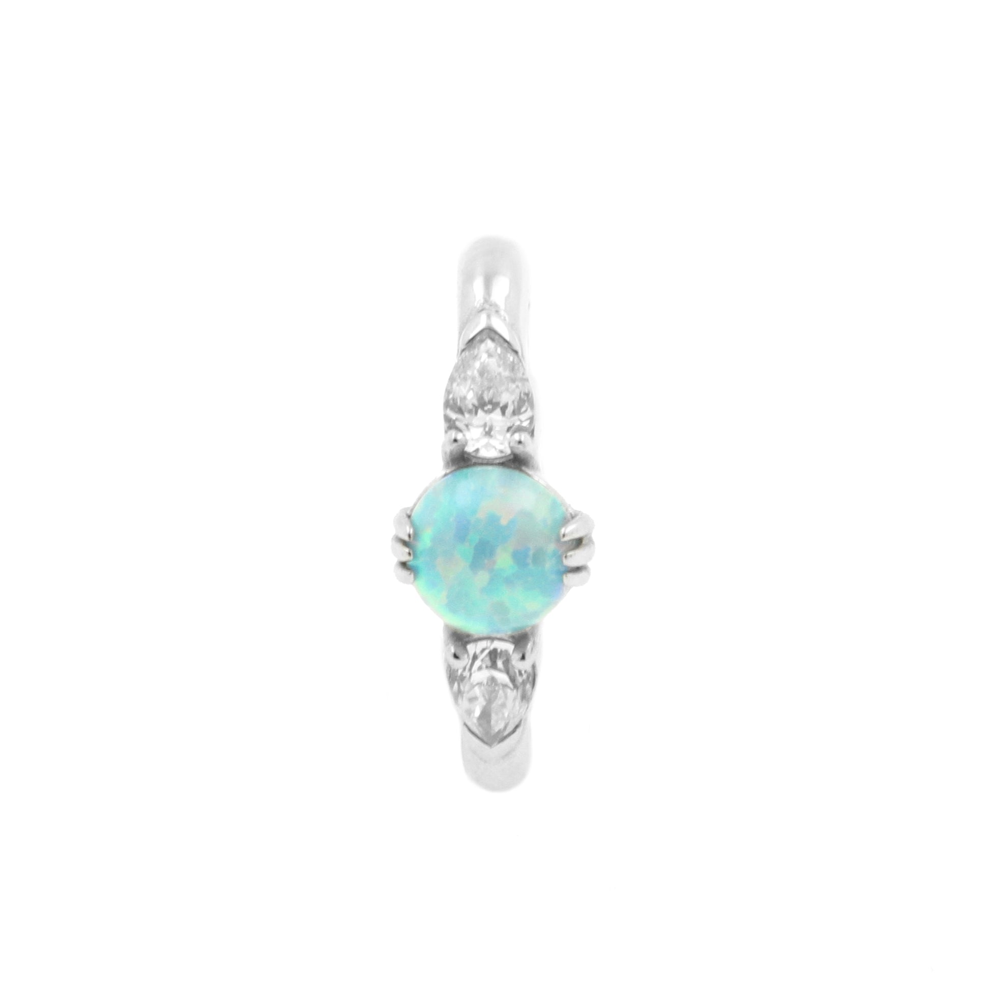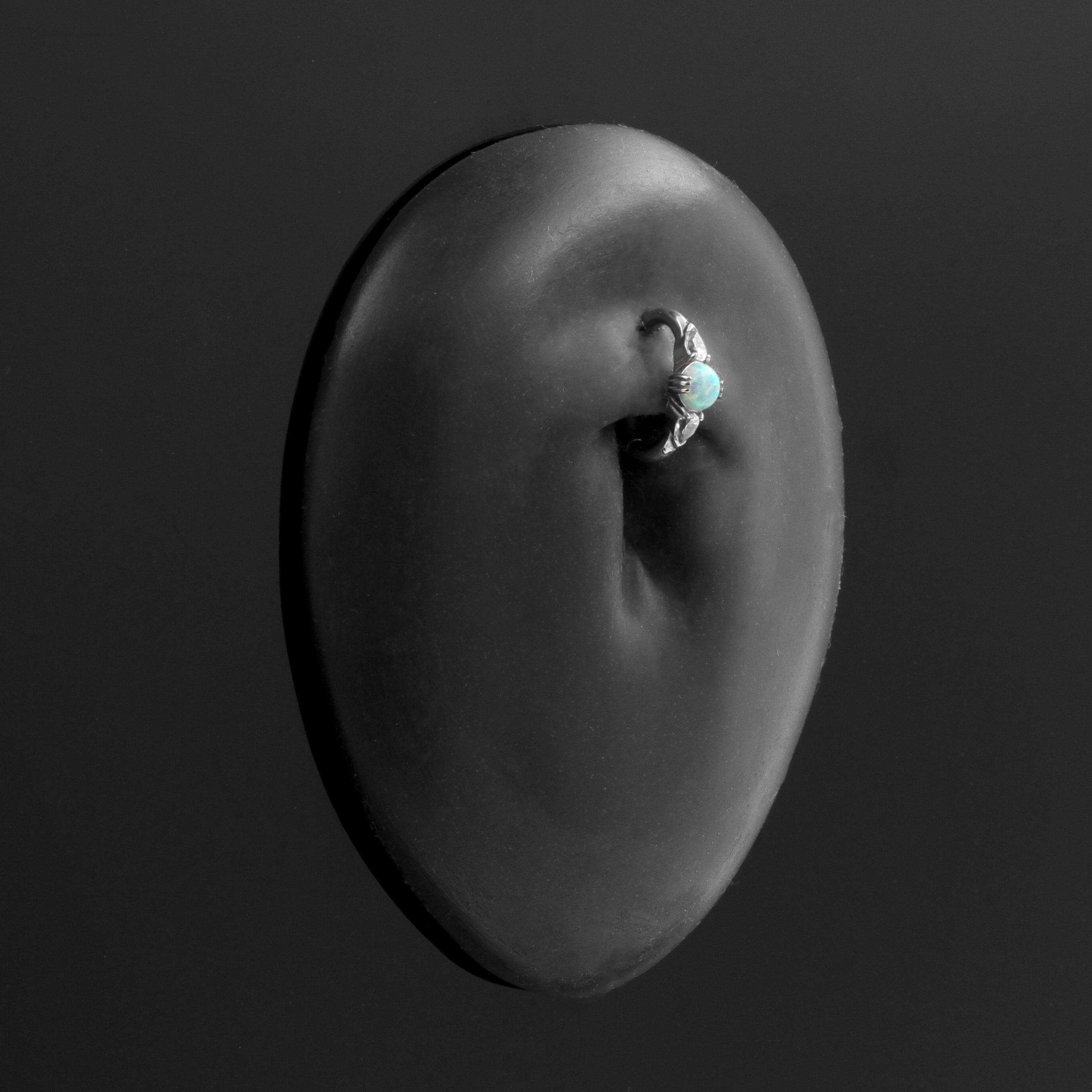 Make your belly ring sparkle with our comfortable belly ring clickers! This lovely belly ring clicker is made of cobalt chromium and set with premium zirconia and synthetic opal. The easy to use clicking mechanism makes chaning your belly ring jewelry a breeze. The oval shape hugs your navel snugly, making these clickers super comfortable to wear. Beautiful belly ring jewelry that is an absolute must have for your jewelry collection!
