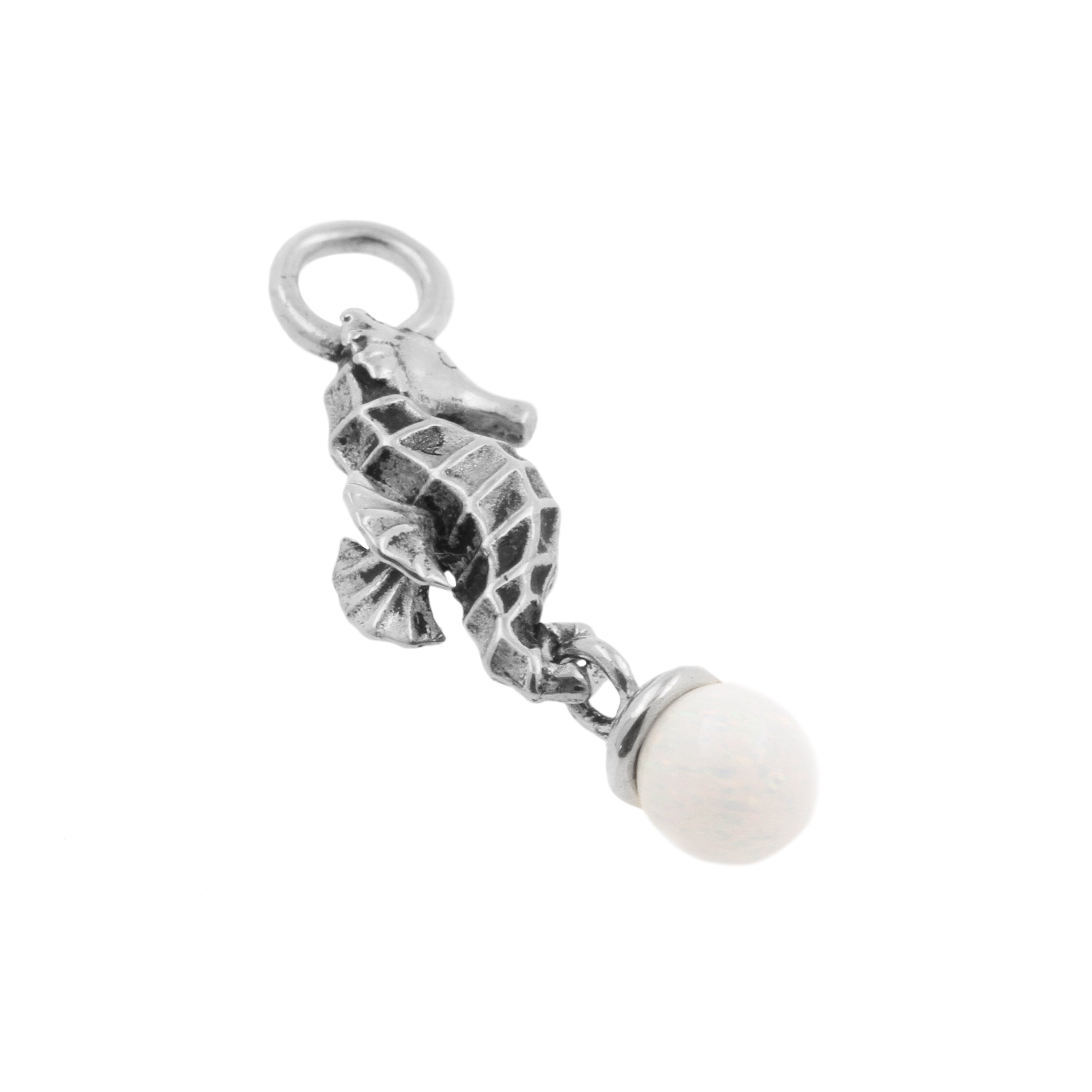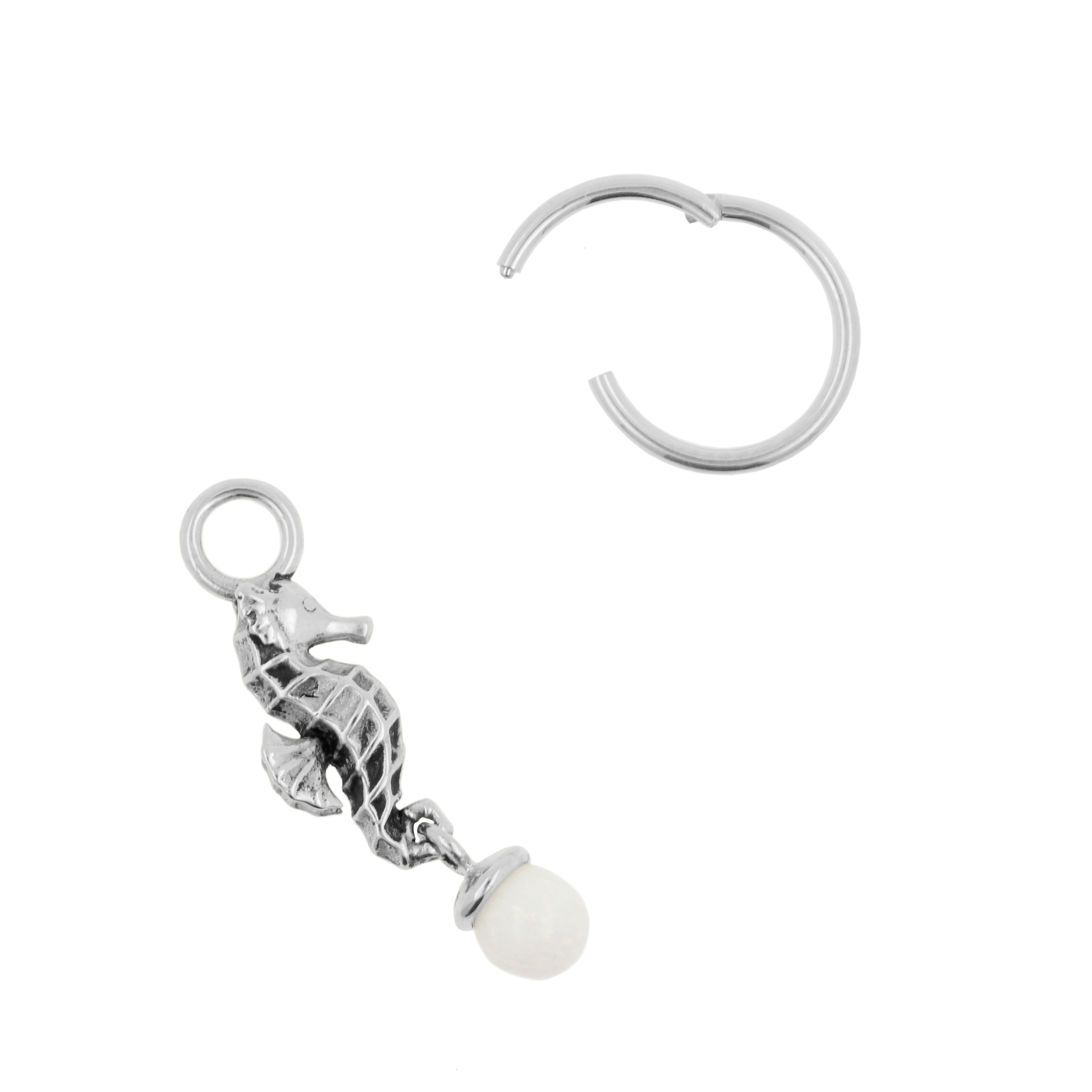 Add refinement to your jewelry with this sea horse charm. Made from Nickel-free Stainless Steel with silver-colored PVD coating with a white-gold sheen (nickel-free). Provided with synthetic opal.