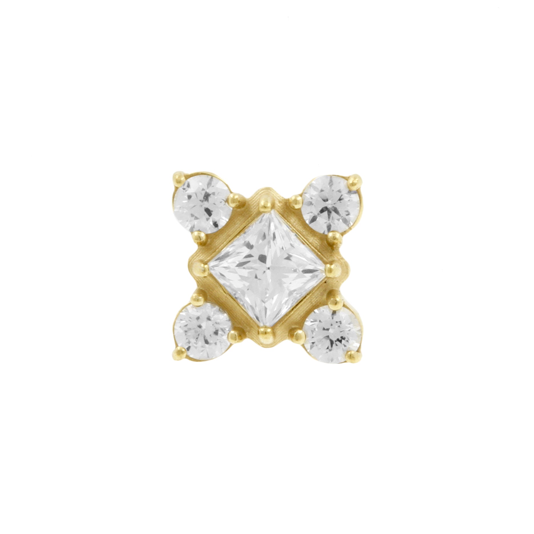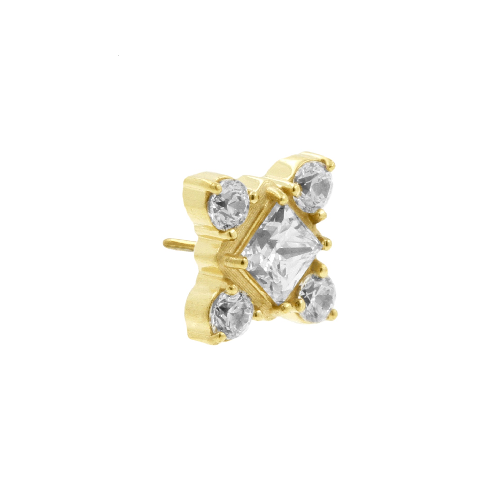 Nickel-Free Stainless Steel Square Cluster Attachment - Gold instantly adds a stylish touch to your piercing. This Threadless Top is made of Nickel-Free Stainless Steel with a cubic zirconia in Clear. The threadless system allows you to easily combine this top with all our bars, which we call Threadless Base, for a perfect fit and ultimate comfort.