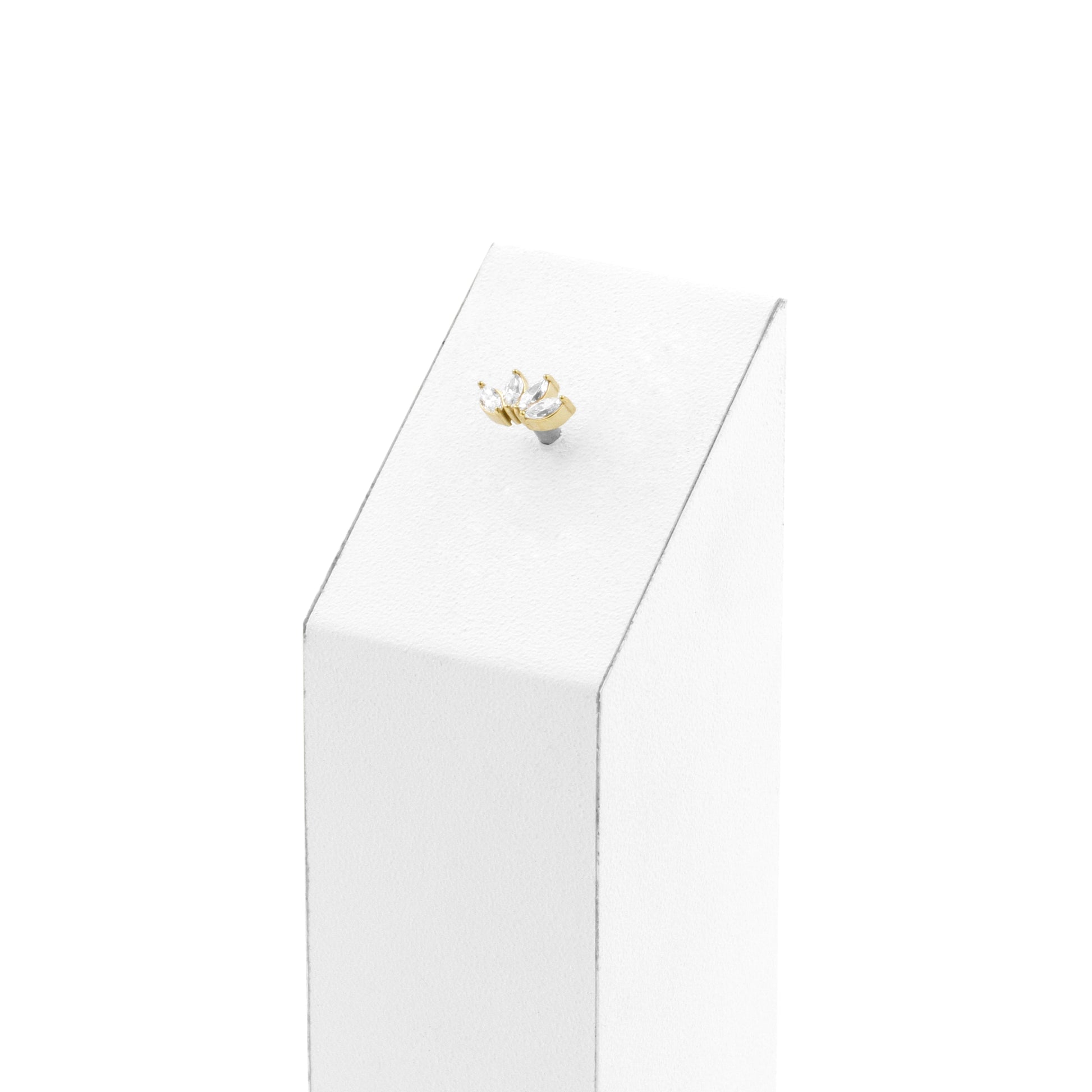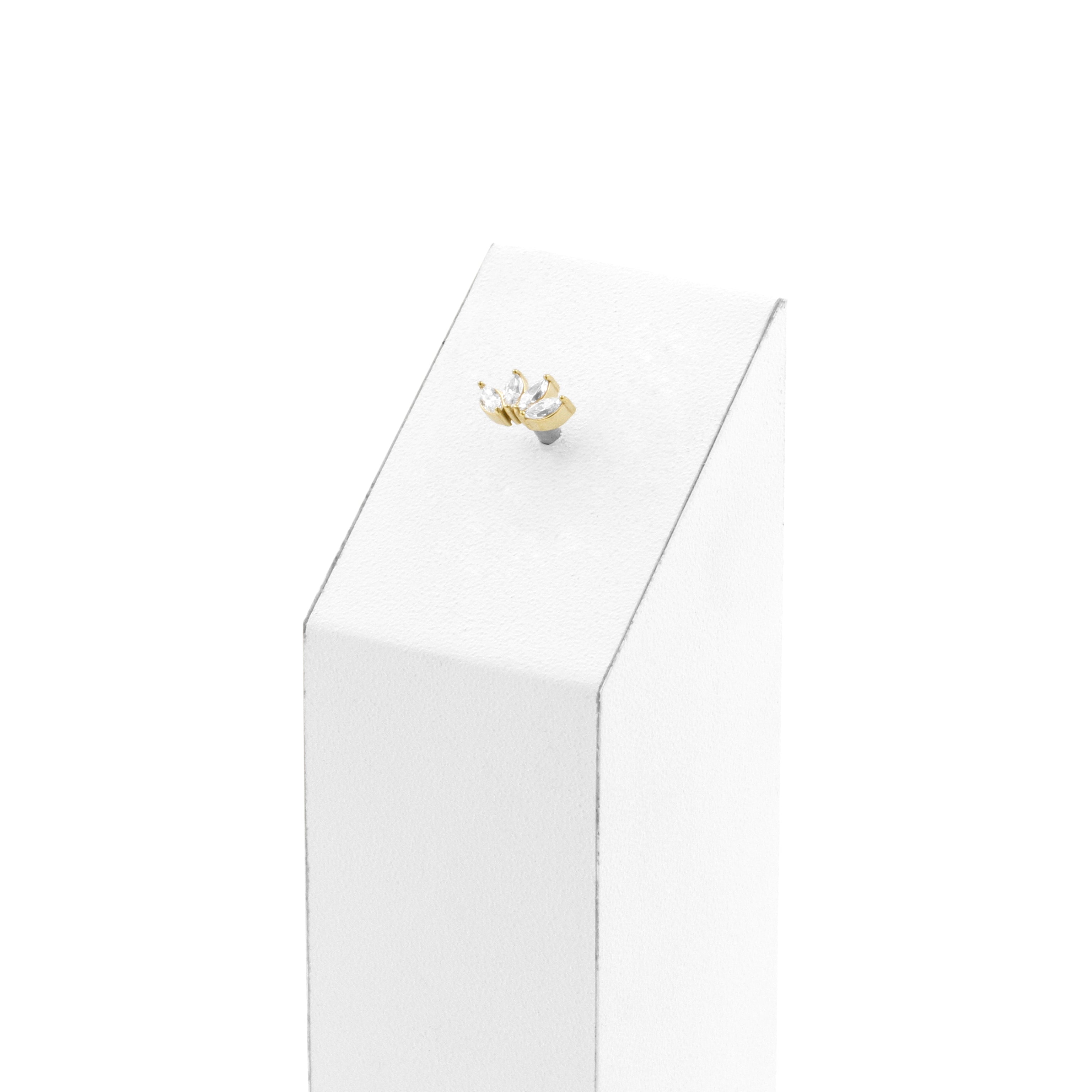 Nickel-Free Stainless Steel - Zirconia Curve - 4 Gems - Gold instantly adds a stylish touch to your piercing. This Threadless Top is made of Nickel-Free Stainless Steel with a cubic zirconia in Clear. The threadless system allows you to easily combine this top with all our bars, which we call Threadless Base, for a perfect fit and ultimate comfort.