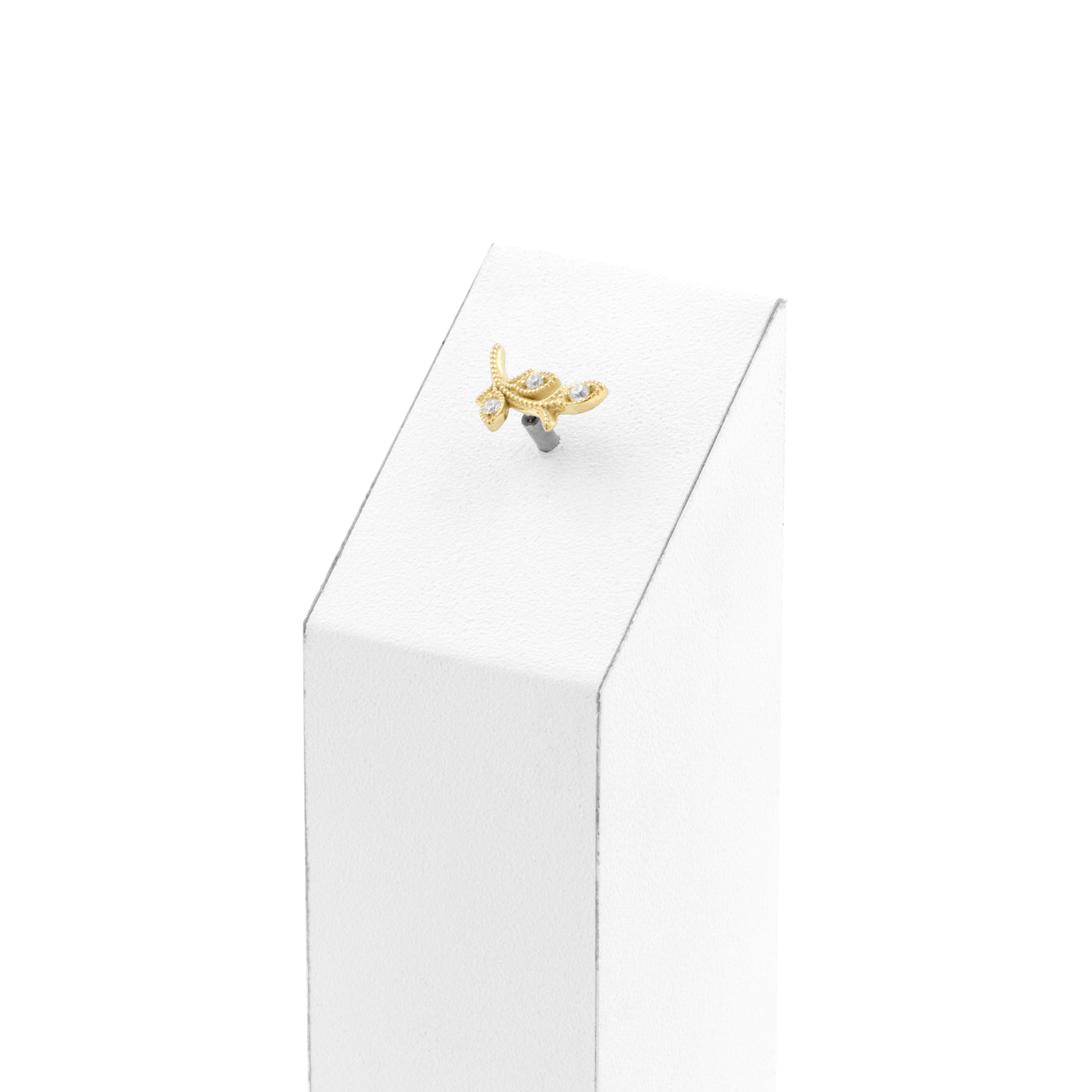 Nickel-Free Stainless Steel - Zirconia Vine - Gold instantly adds a stylish touch to your piercing. This Threadless Top is made of Nickel-Free Stainless Steel with a cubic zirconia in Clear. The threadless system allows you to easily combine this top with all our bars, which we call Threadless Base, for a perfect fit and ultimate comfort.