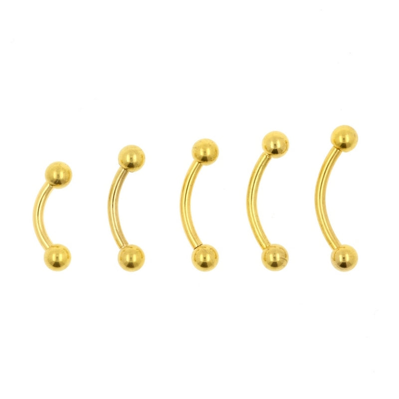 The essential basics, with a touch of real gold! These curved barbells measure 1,2 mm in thickness and are made of surgical 316L steel, with a P.V.D coating made of real 24K gold! The new coating techniques that are used to create this piece of jewelry ensure top notch quality and a wear-resistant, high sheen finish. Great to keep at hand whenever you need a replacement, or simply want to switch to another size. Our curved barbells are a perfect match with our 24k gold P.V.D. coated piercing jewelry range.