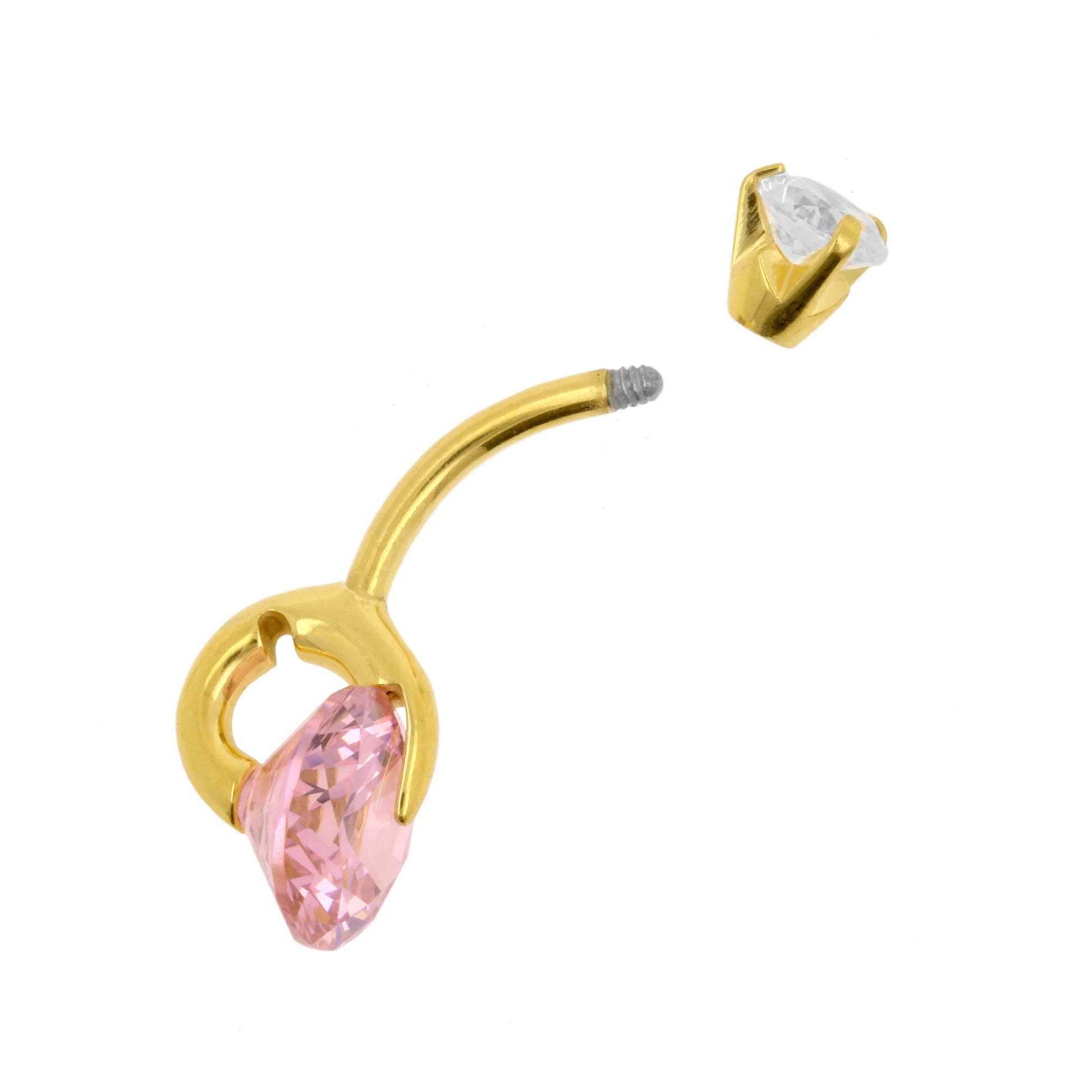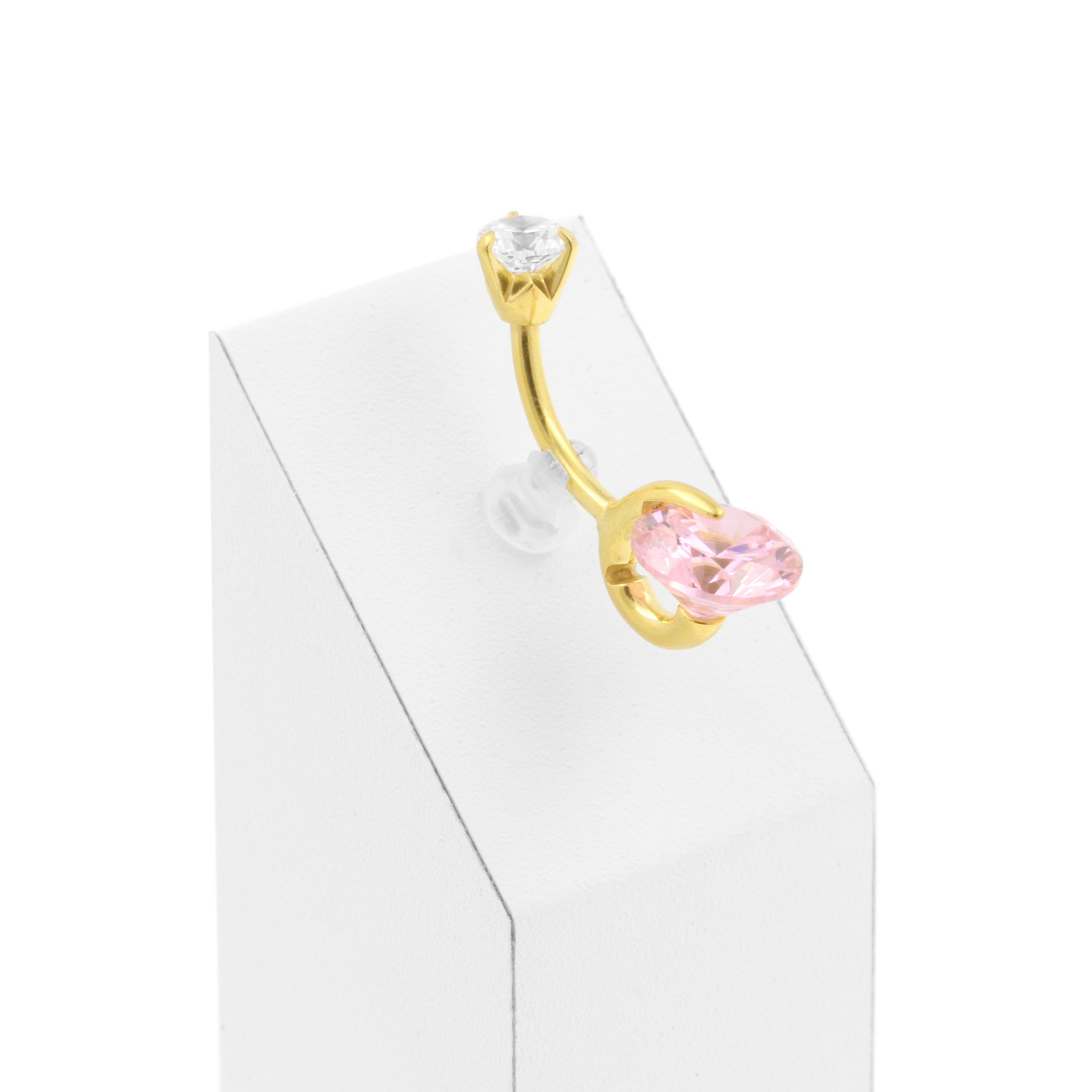Elegant and refined — this belly bar features a pink cubic zirconia in a floating style for maximum visibility and sparkle. The 24 karat P.V.D. gold coating on surgical steel adds a warm, luxurious finish that lasts. The coating is water-resistant and color-stable, ideal for everyday wear.
