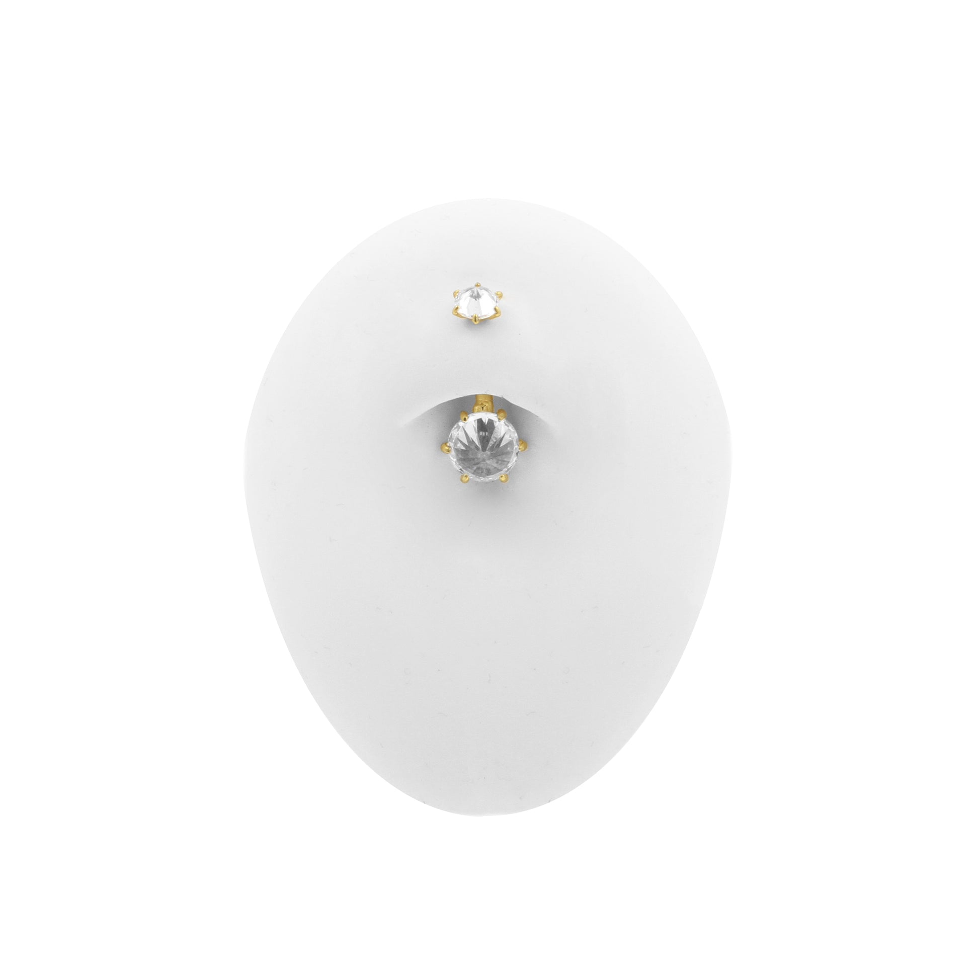 Elegant and refined — this belly bar highlights a clear cubic zirconia that catches the light beautifully. The 24 karat P.V.D. gold coating on surgical steel adds a warm, luxurious finish that lasts. The coating is water-resistant and color-stable, ideal for everyday wear.