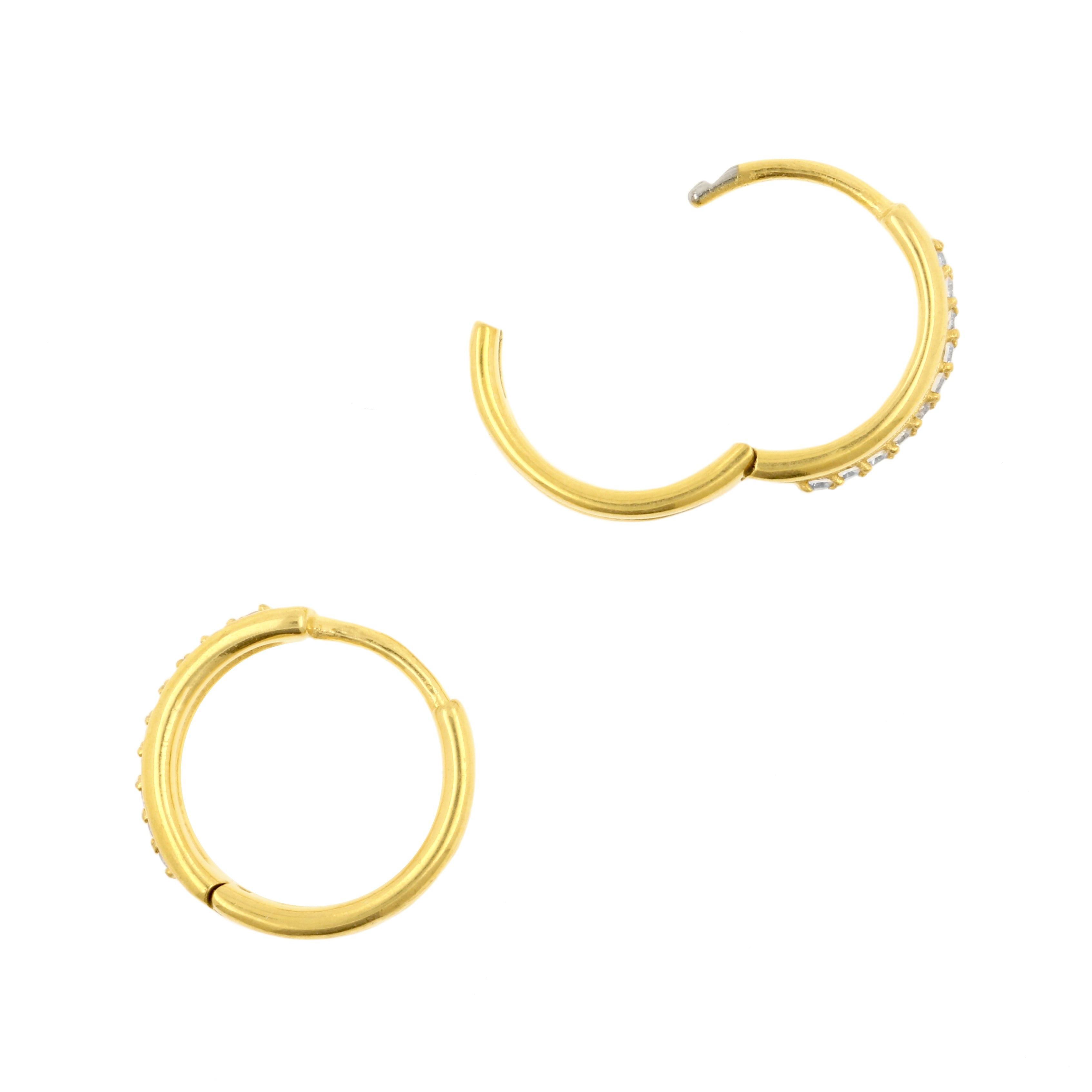 Elevate your look with surgical steel click hoops in a refined gold tone, set with zirconia. Sleek, durable and sparkly — perfect on their own or stacked.