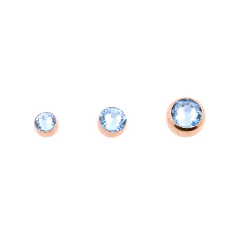 The essential basics, with a touch of rose gold! These threaded, jewelled balls are are set with a small crystal and made of surgical 316L steel, with a rose gold P.V.D coating. The new coating techniques that are used to create this piece of jewelry ensure top notch quality and a wear-resistant, high sheen finish. Great to keep at hand whenever you need a replacement, or simply want to switch to another size. Our threaded balls are a perfect match with our rose gold P.V.D. coated piercing jewelry range.