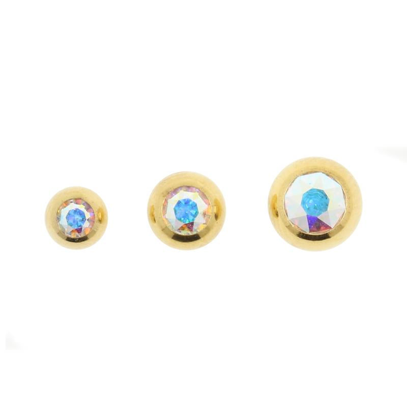 The essential basics, with a touch of real gold! These threaded, jewelled balls are are set with a small crystal and made of surgical 316L steel, with a P.V.D coating made of real 24K gold! The new coating techniques that are used to create this piece of jewelry ensure top notch quality and a wear-resistant, high sheen finish. Great to keep at hand whenever you need a replacement, or simply want to switch to another size. Our threaded balls are a perfect match with our 24k gold P.V.D. coated piercing jewelry range.