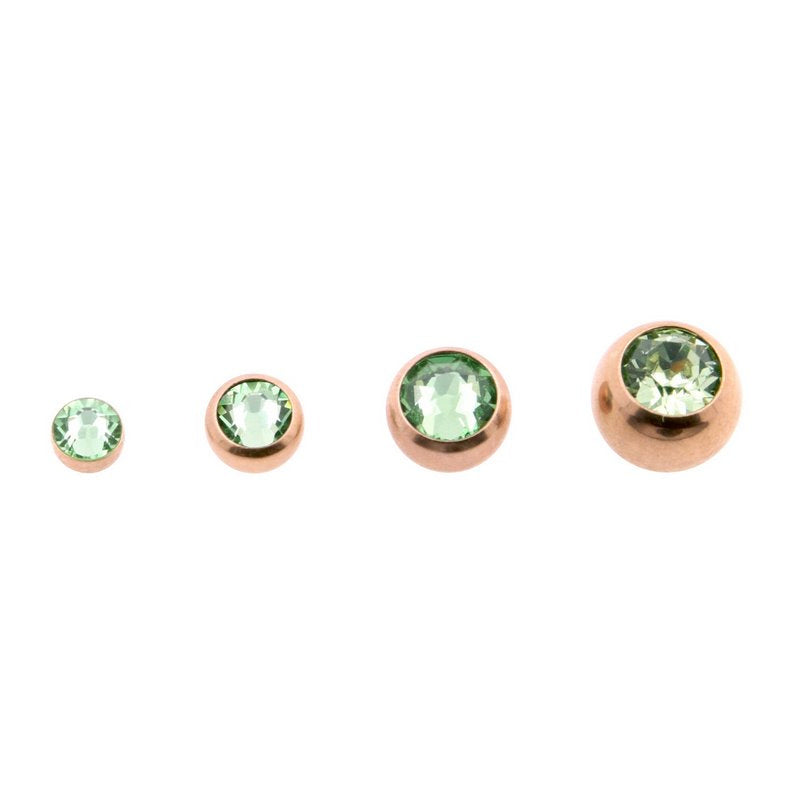 The essential basics, with a touch of rose gold! These threaded, jewelled balls are are set with a small crystal and made of surgical 316L steel, with a rose gold P.V.D coating. The new coating techniques that are used to create this piece of jewelry ensure top notch quality and a wear-resistant, high sheen finish. Great to keep at hand whenever you need a replacement, or simply want to switch to another size. Our threaded balls are a perfect match with our rose gold P.V.D. coated piercing jewelry range.