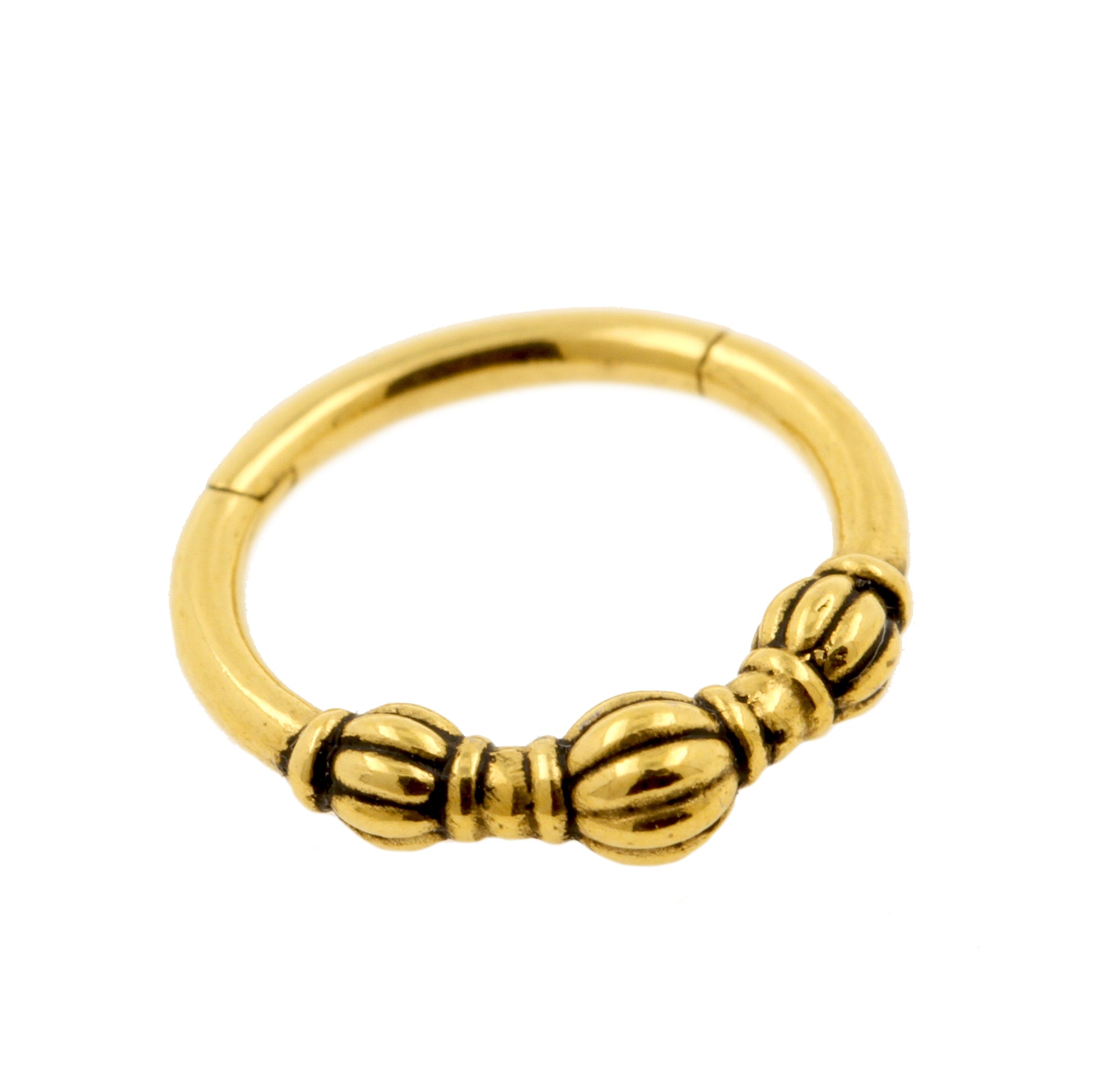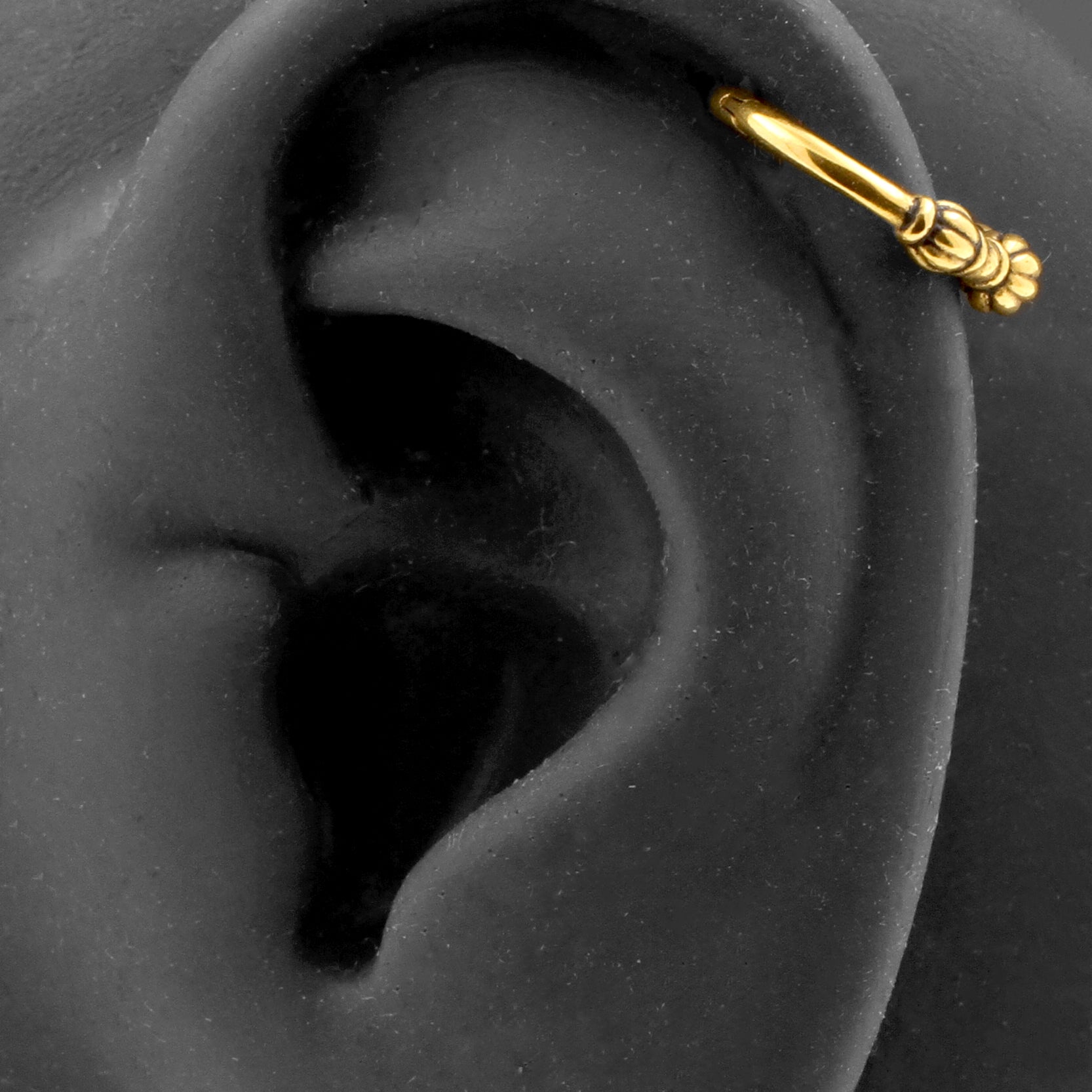 High quality piercing ring with easy to use clicking mechanism! This beautiful ring is features beautiful, vintage style decoration and has a curved stem. The rings suitable for all kinds of piercings, giving them an extra fancy look in an instant. Made of high quality surgical steel with a mirror finish and available in different colors and designs.