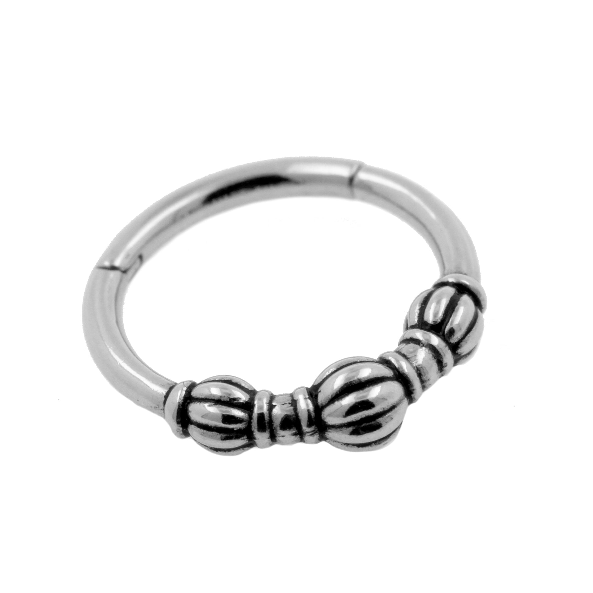 High quality piercing ring with easy to use clicking mechanism! This beautiful ring is features beautiful, vintage style decoration and has a curved stem. The rings suitable for all kinds of piercings, giving them an extra fancy look in an instant. Made of high quality surgical steel with a mirror finish and available in different colors and designs.