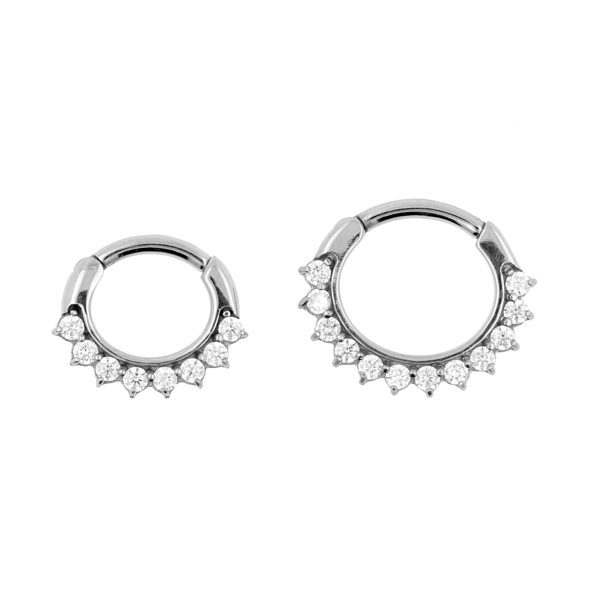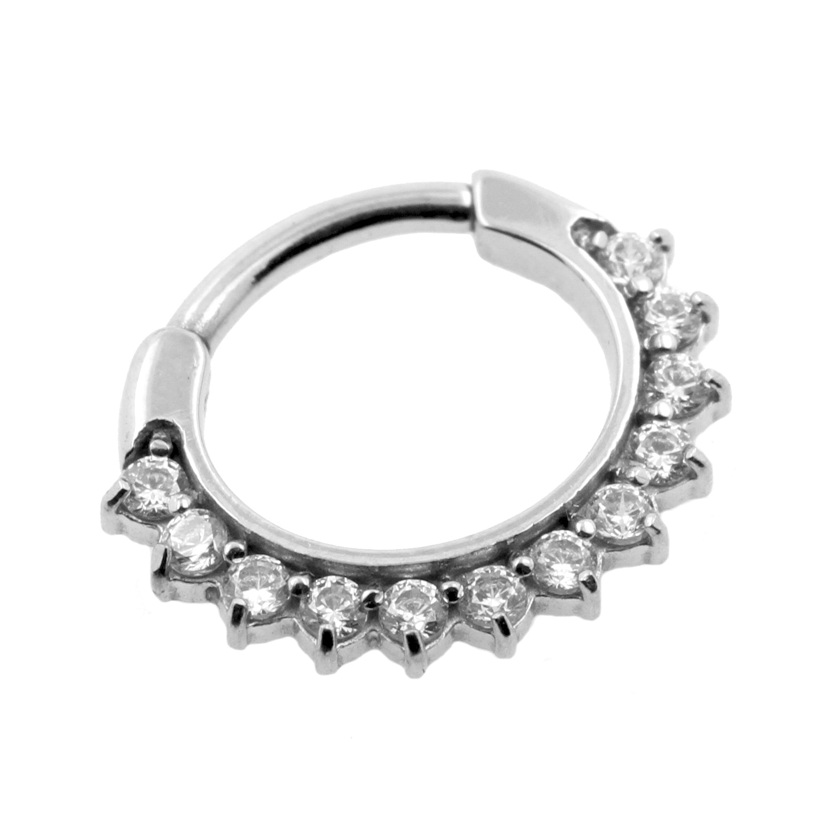 High quality septum ring. This beautiful ring is set with bright, shiny cubic zirconia gems and has a curved stem. The rings are small for a snug fit around your septum, making them extra fancy. Made of high quality surgical steel with a mirror finish.