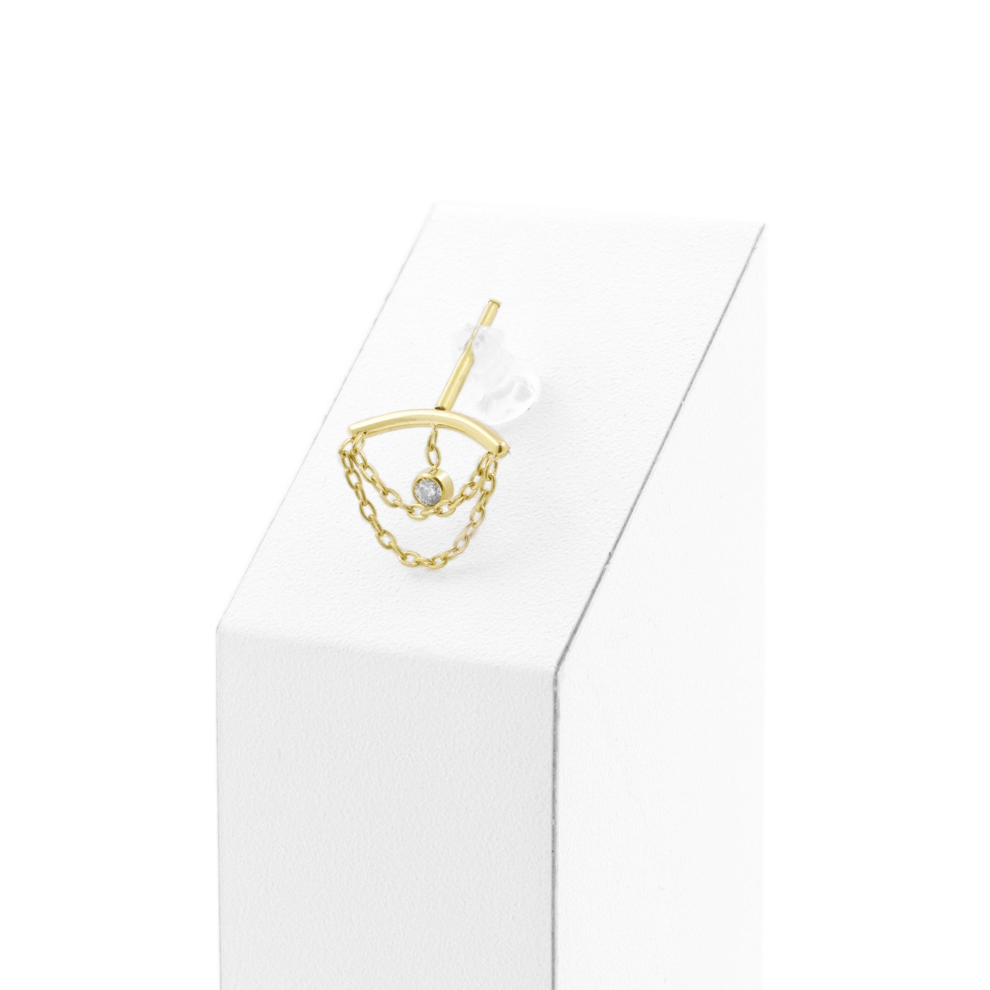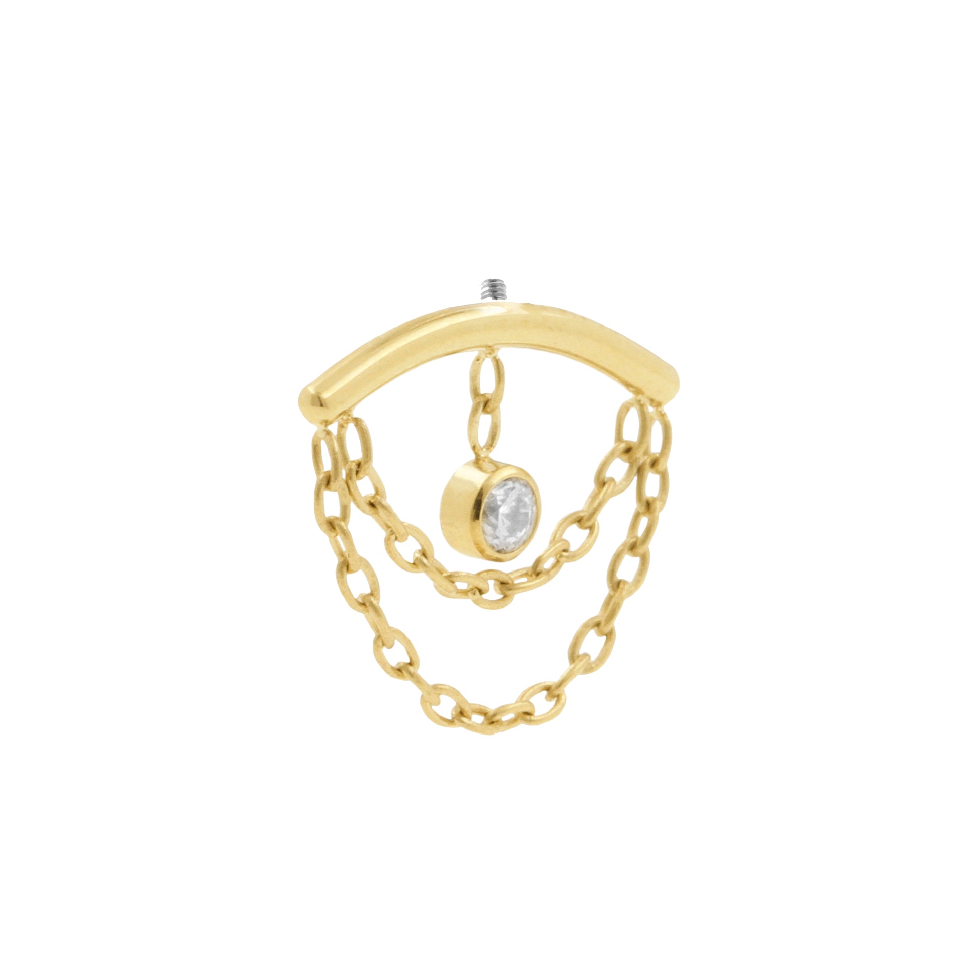 Give your vertical helix piercing an elegant look with this titanium curve, featuring dangling sparkling clear cubic zirconia. The titanium is finished with 18k PVD gold coating that matches the color of our solid gold assortment. This piece is internally threaded and compatible with 1.2 mm internally threaded bars, ensuring safe and comfortable wear.