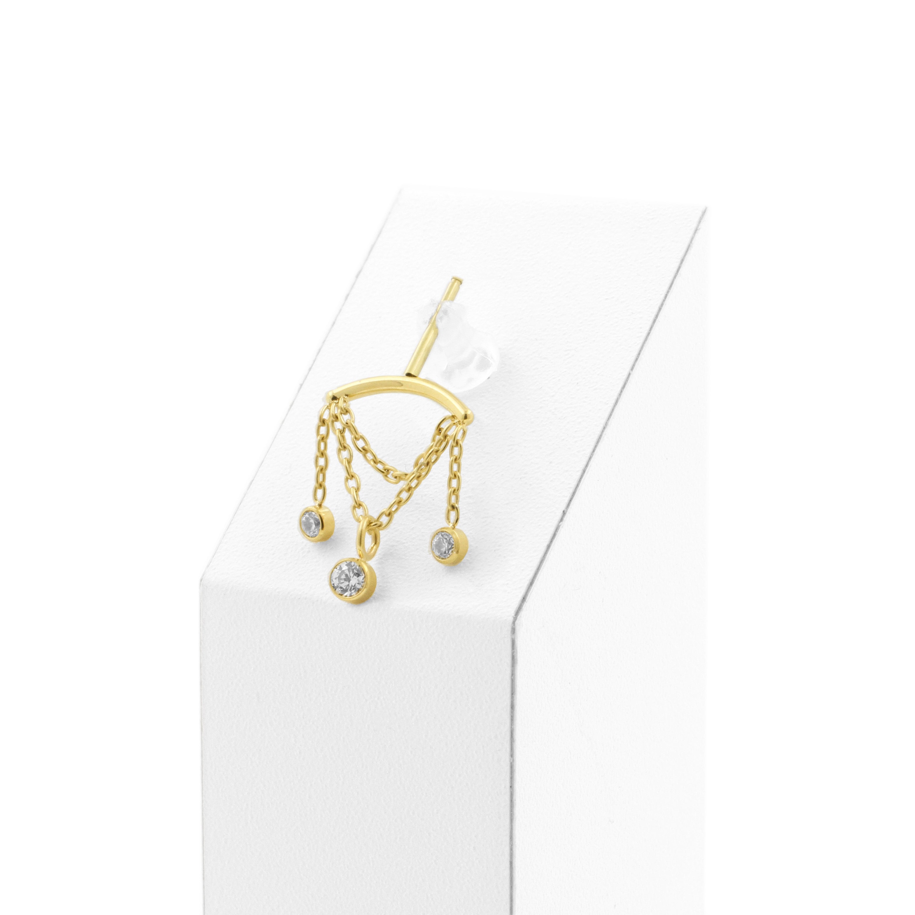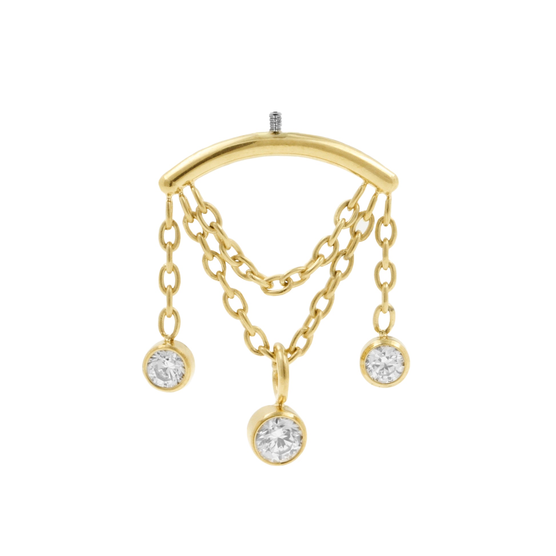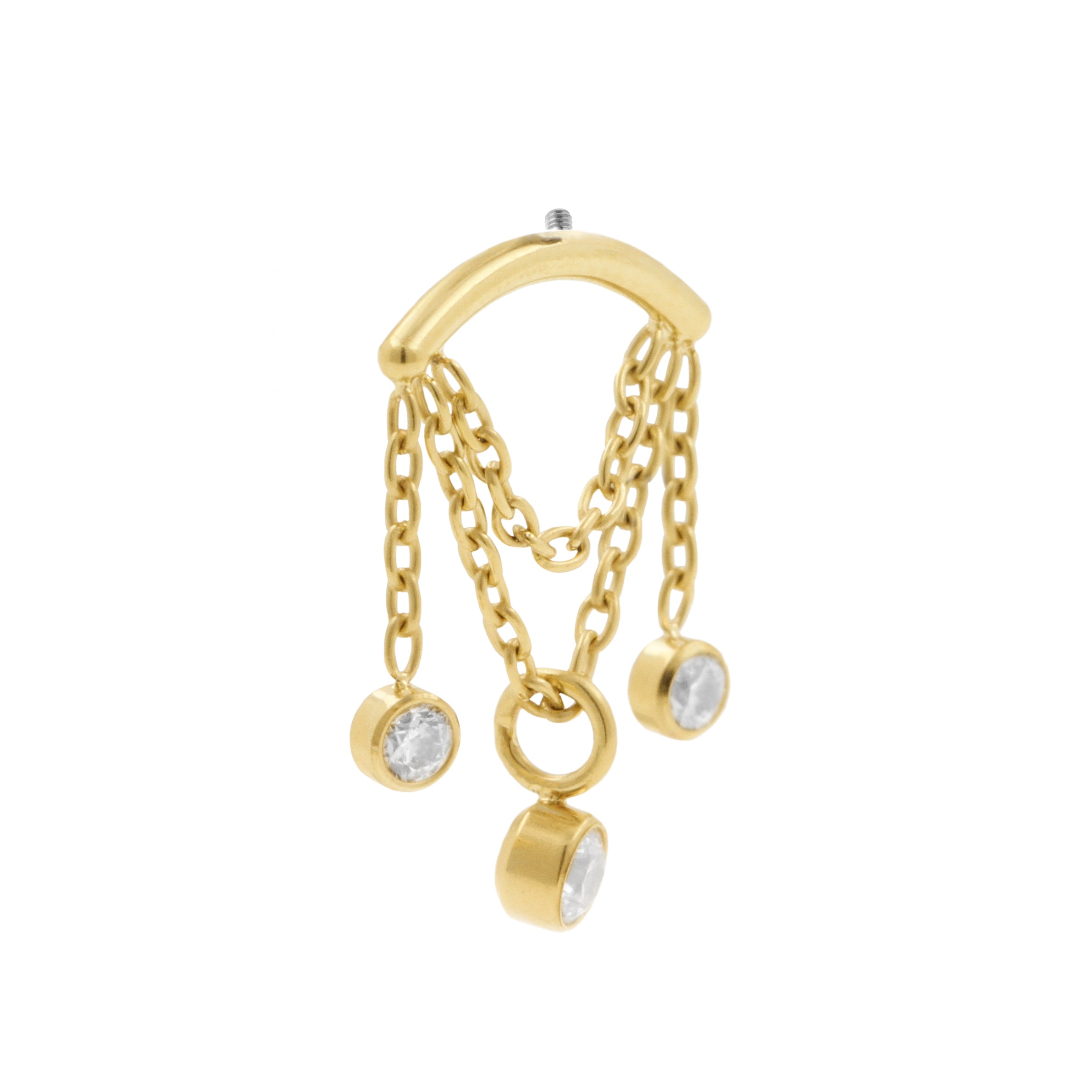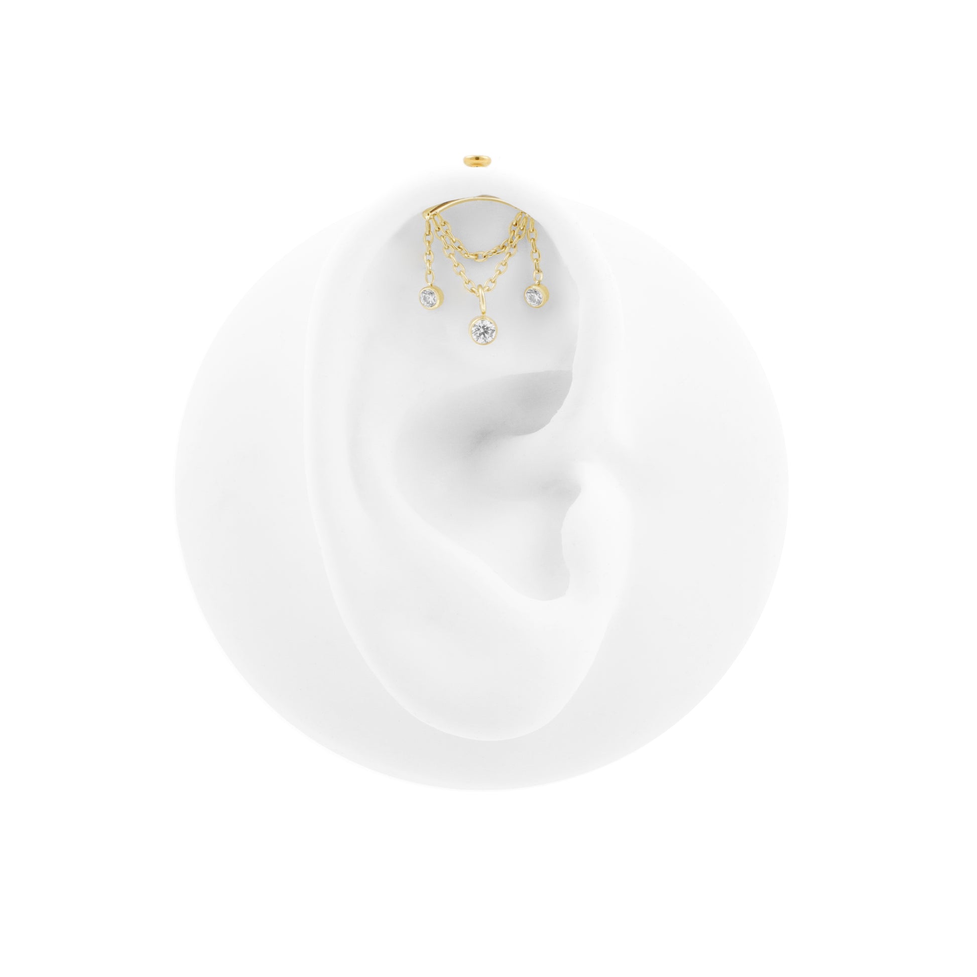 Give your vertical helix piercing an elegant look with this titanium curve, featuring dangling sparkling clear cubic zirconia. The titanium is finished with 18k PVD gold coating that matches the color of our solid gold assortment. This piece is internally threaded and compatible with 1.2 mm internally threaded bars, ensuring safe and comfortable wear.