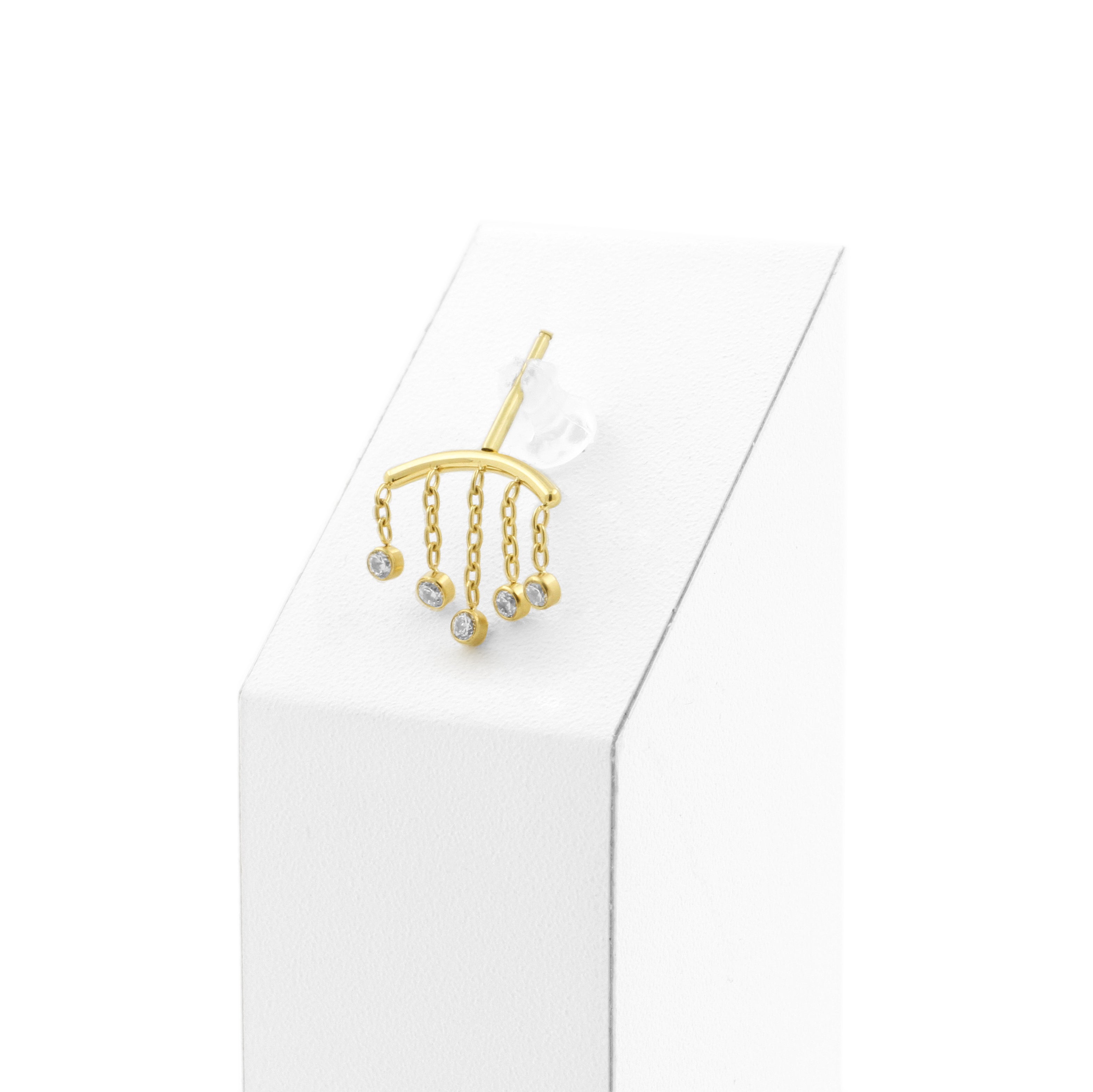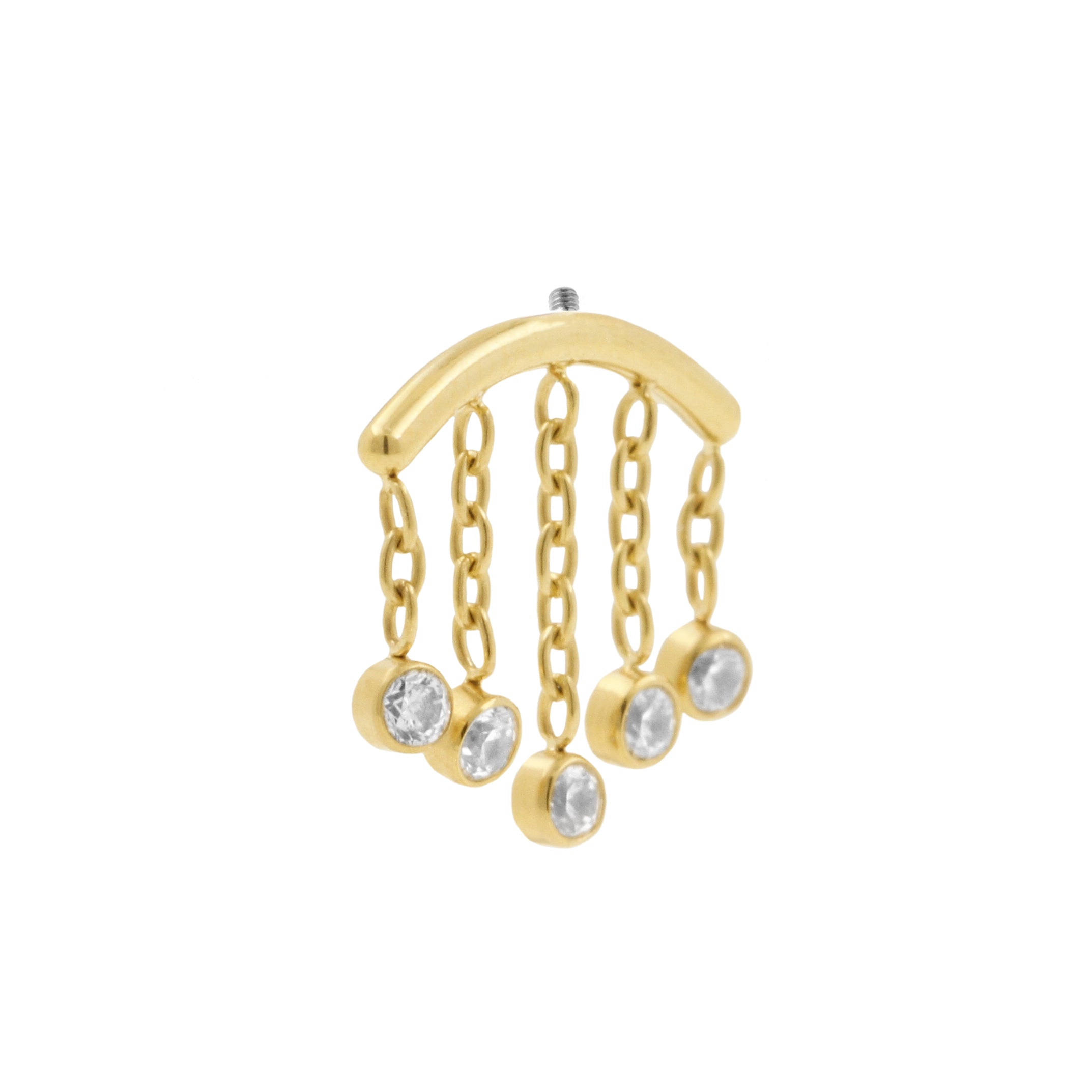 Give your vertical helix piercing an elegant look with this titanium curve, featuring dangling sparkling clear cubic zirconia. The titanium is finished with 18k PVD gold coating that matches the color of our solid gold assortment. This piece is internally threaded and compatible with 1.2 mm internally threaded bars, ensuring safe and comfortable wear.
