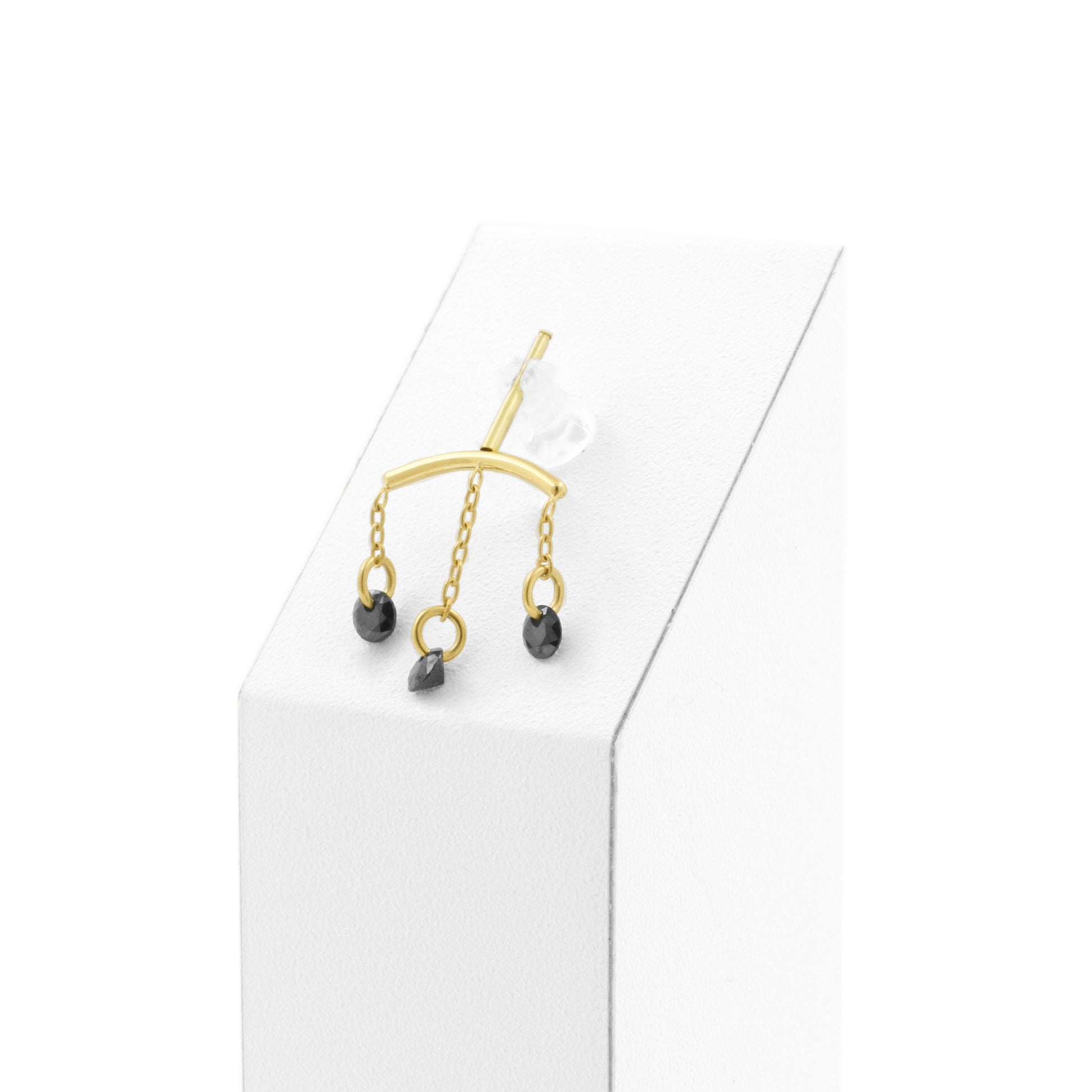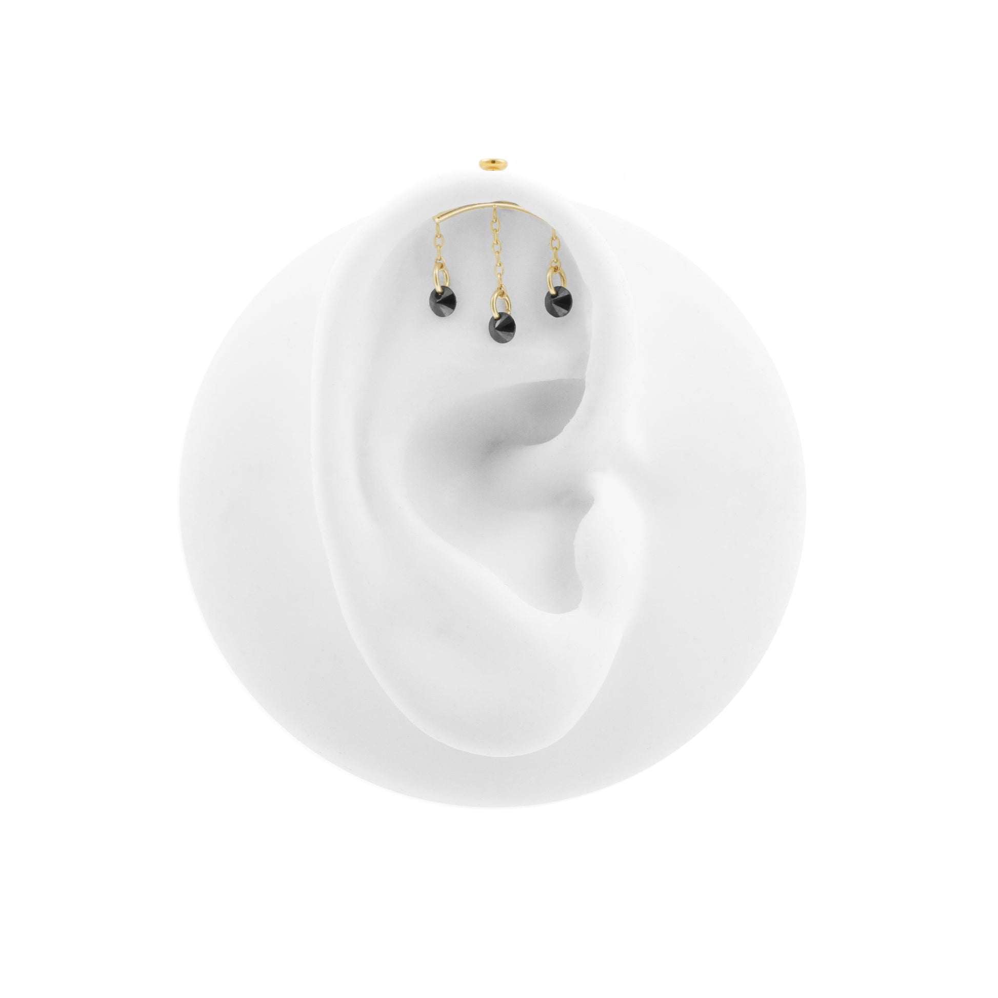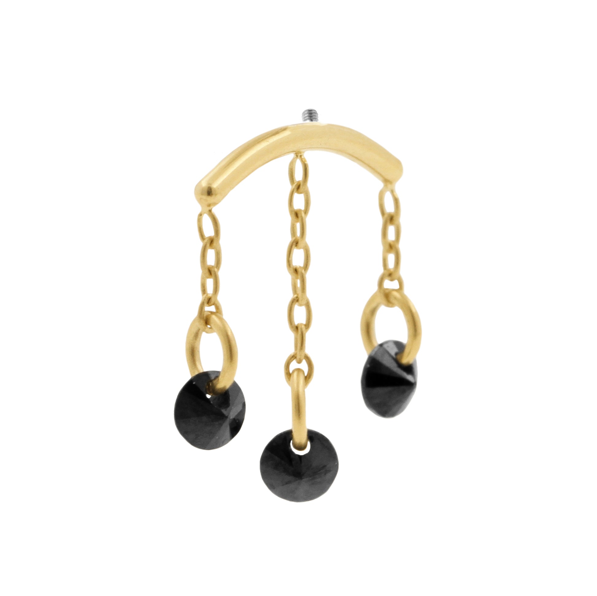 Give your vertical helix piercing an elegant look with this titanium curve, featuring dangling sparkling black cubic zirconia. The titanium is finished with 18k PVD gold coating that matches the color of our solid gold assortment. This piece is internally threaded and compatible with 1.2 mm internally threaded bars, ensuring safe and comfortable wear.