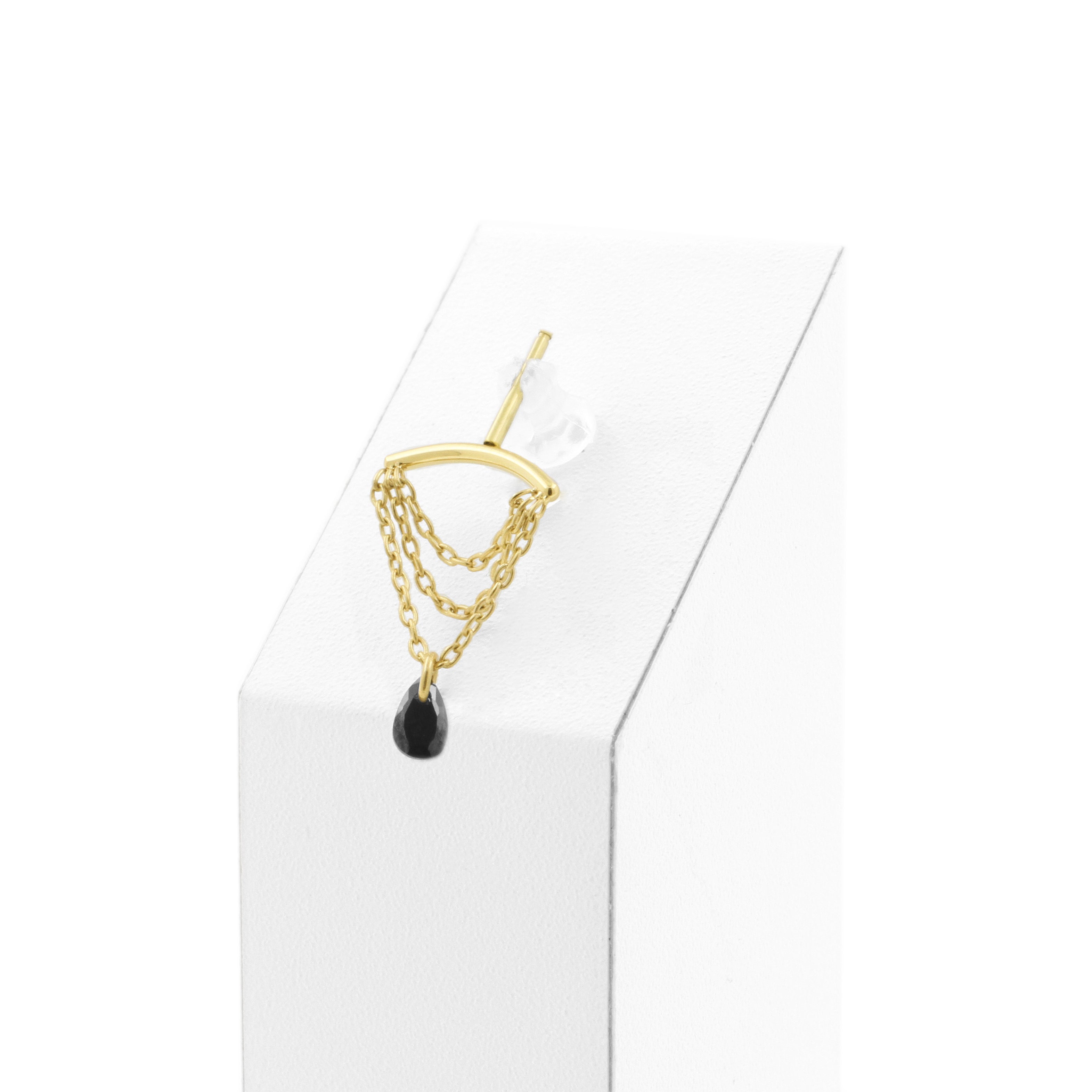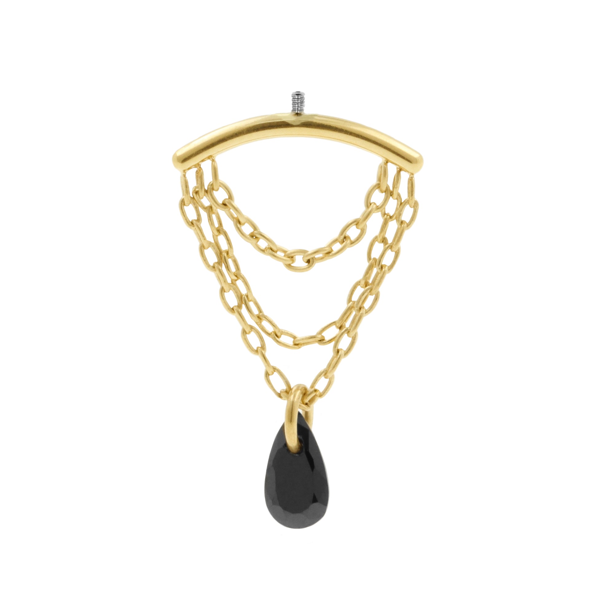 Give your vertical helix piercing an elegant look with this titanium curve, featuring dangling sparkling black cubic zirconia. The titanium is finished with 18k PVD gold coating that matches the color of our solid gold assortment. This piece is internally threaded and compatible with 1.2 mm internally threaded bars, ensuring safe and comfortable wear.