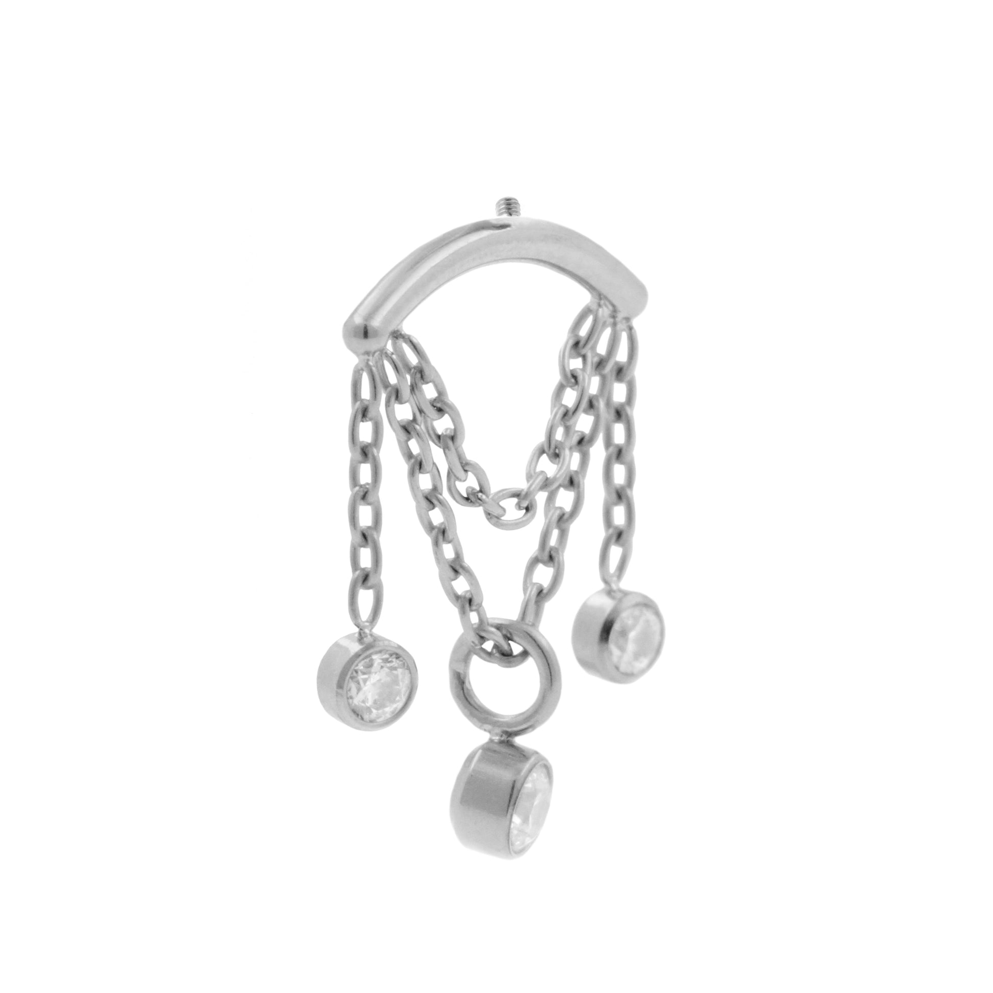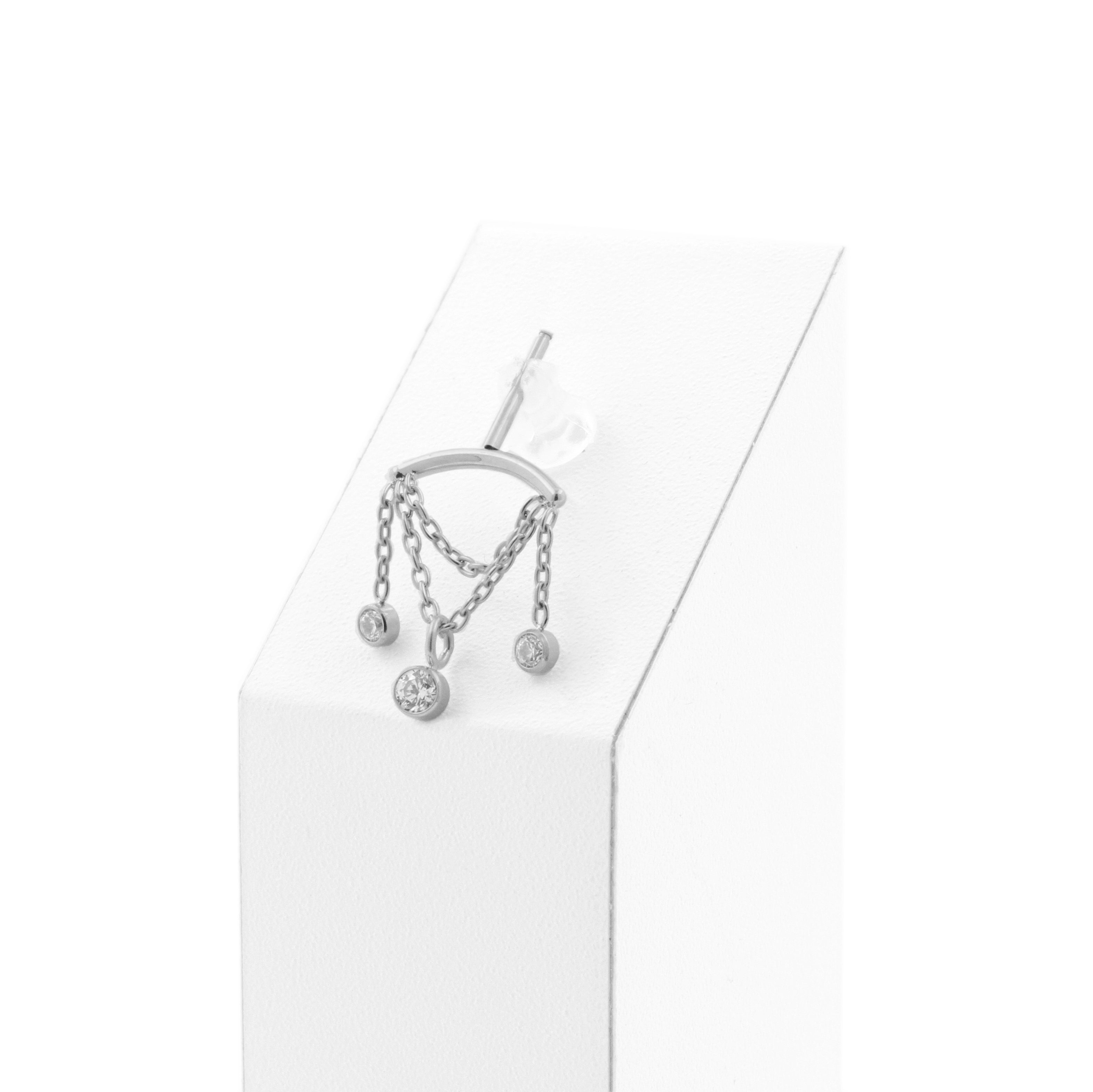 Give your vertical helix piercing an elegant look with this titanium curve, featuring dangling sparkling clear cubic zirconia. The titanium is finished with silver-colored PVD CoCr coating with the look of white gold (nickel-free). This piece is internally threaded and compatible with 1.2 mm internally threaded bars, ensuring safe and comfortable wear.