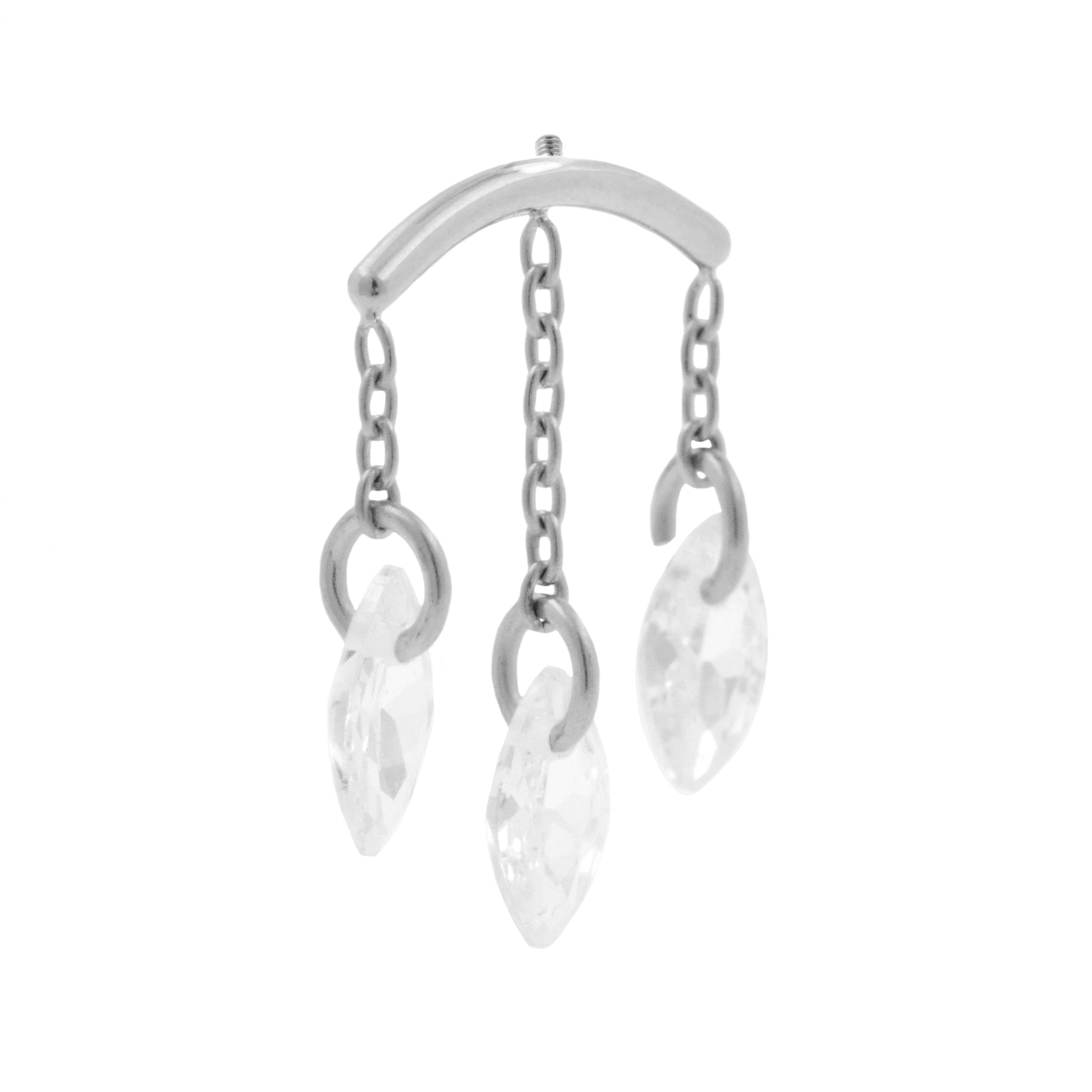 Give your vertical helix piercing an elegant look with this titanium curve, featuring dangling sparkling clear cubic zirconia. The titanium is finished with silver-colored PVD CoCr coating with the look of white gold (nickel-free). This piece is internally threaded and compatible with 1.2 mm internally threaded bars, ensuring safe and comfortable wear.