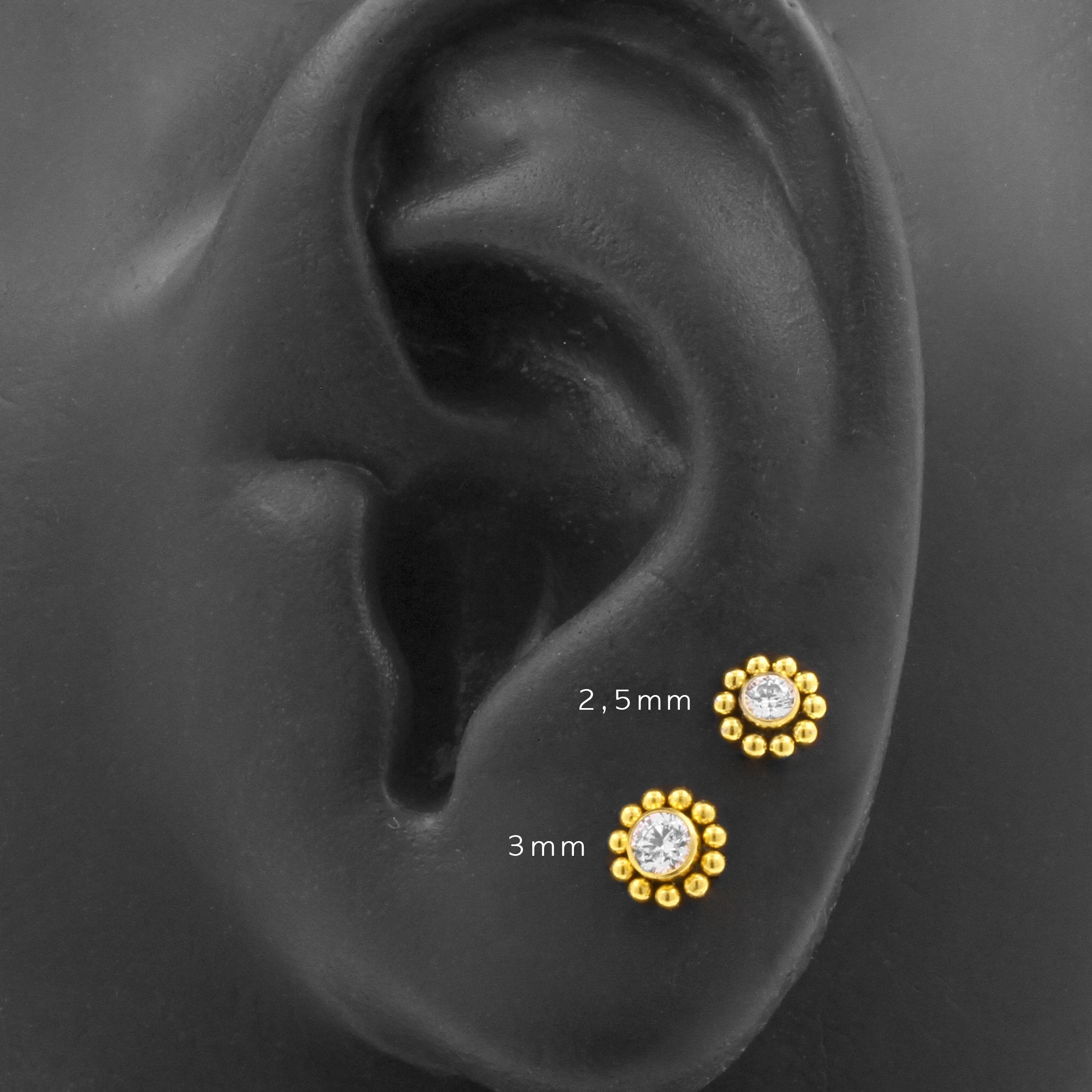 Stand out in the crowd with our Titanium Zirconia Cluster piercing jewelry! These clusters are perfect for all kinds of piercings. Each cluster is set with beautiful zirconias and made of titanium with 24 karat gold P.V.D. coating. Suitable for 1,2 mm internally threaded piercing jewelry. (Extra info: the thread of the accessory itself measures 0,8 mm in thickness and is suitable for 1,2 mm All Over Piercings internally threaded piercing jewelry). You will receive the cluster accessory only upon ordering, without stud or post. Please note that due to the unique shape of the attachment, changing jewelry might be a bit more challenging. But practice makes perfect and it will all be more than worth it in the end, because our Zirconia Clusters will turn your piercings into real eyecatchers!