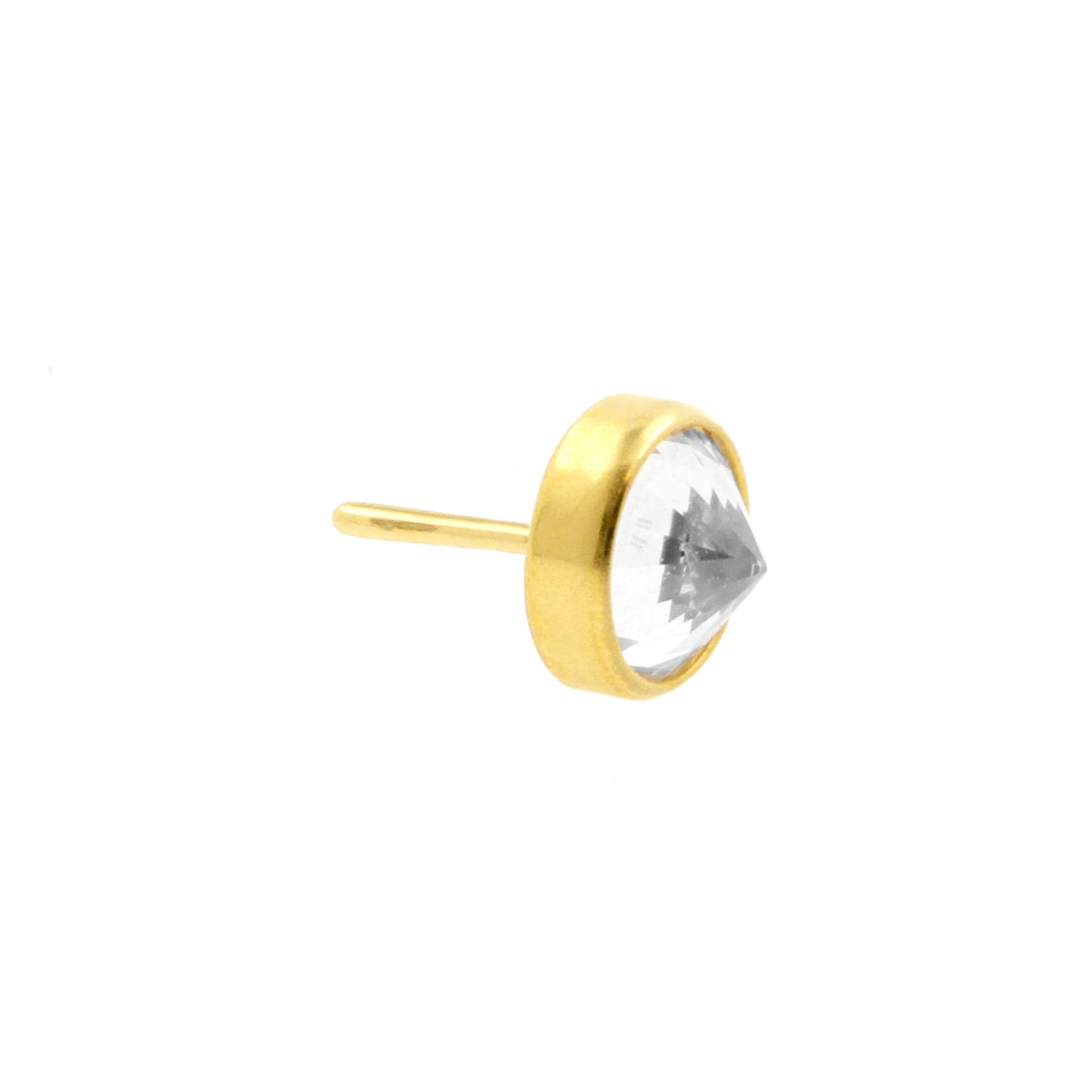 Titanium Zirconia Disc - Threadless - Gold instantly adds a stylish touch to your piercing. This Threadless Top is made of Titanium with a cubic zirconia in Clear. The threadless system allows you to easily combine this top with all our bars, which we call Threadless Base, for a perfect fit and ultimate comfort.