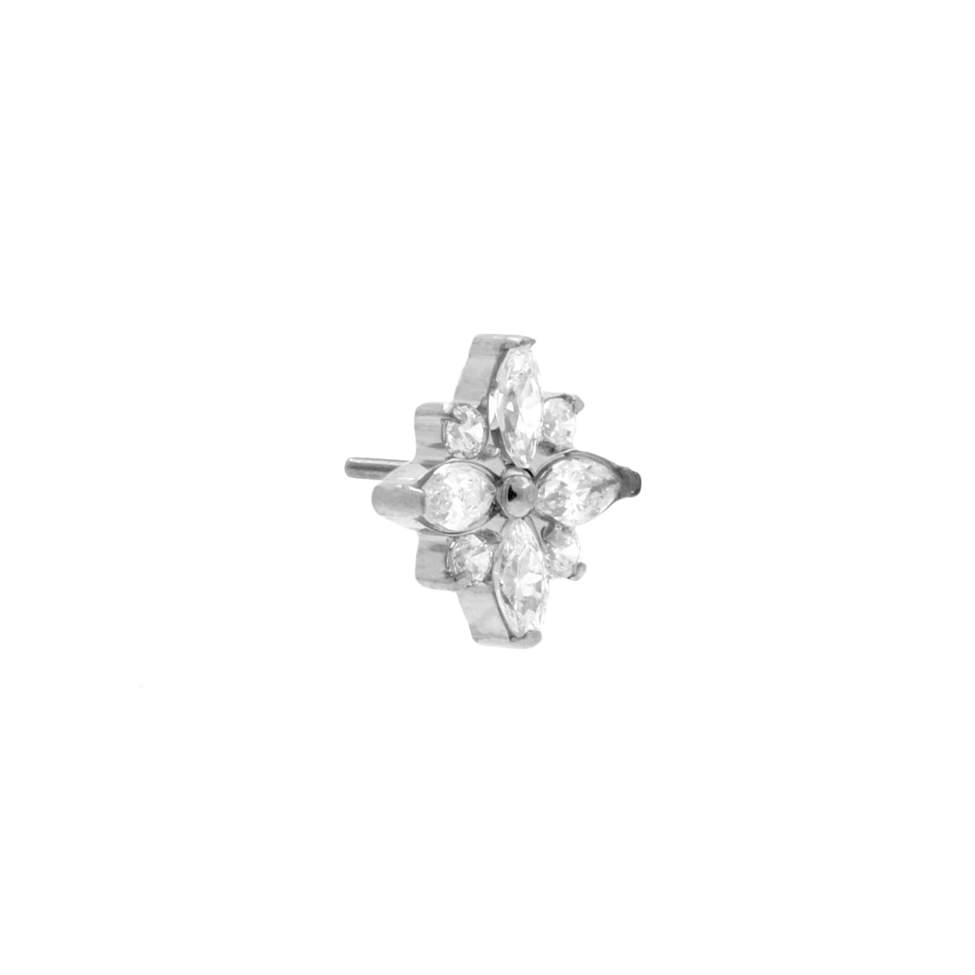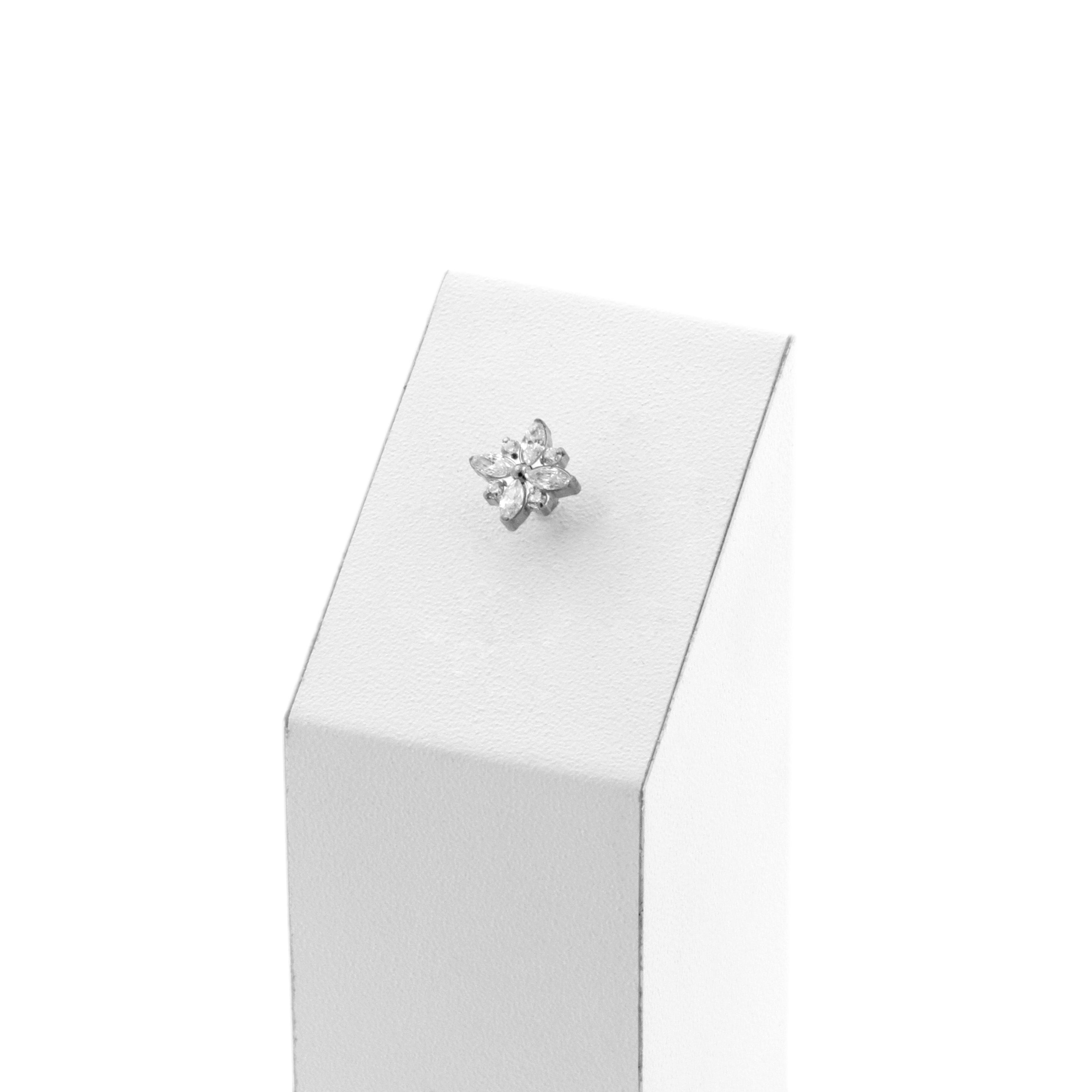 Titanium Zirconia Star Cluster - Silver instantly adds a stylish touch to your piercing. This Threadless Top is made of Titanium with a cubic zirconia in Clear. The threadless system allows you to easily combine this top with all our bars, which we call Threadless Base, for a perfect fit and ultimate comfort.